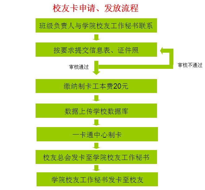 一、工作流程:办理“校友卡”需审核校友个人信息,特别是需确认“学号”(经档案馆查询),故目前校友卡主要通过班级统一申请办理。请班级(年级)负责人与所在学院校友工作秘书联系,按要求收集需办卡校友信息并提交所在学院,进入办理流程统一办理。