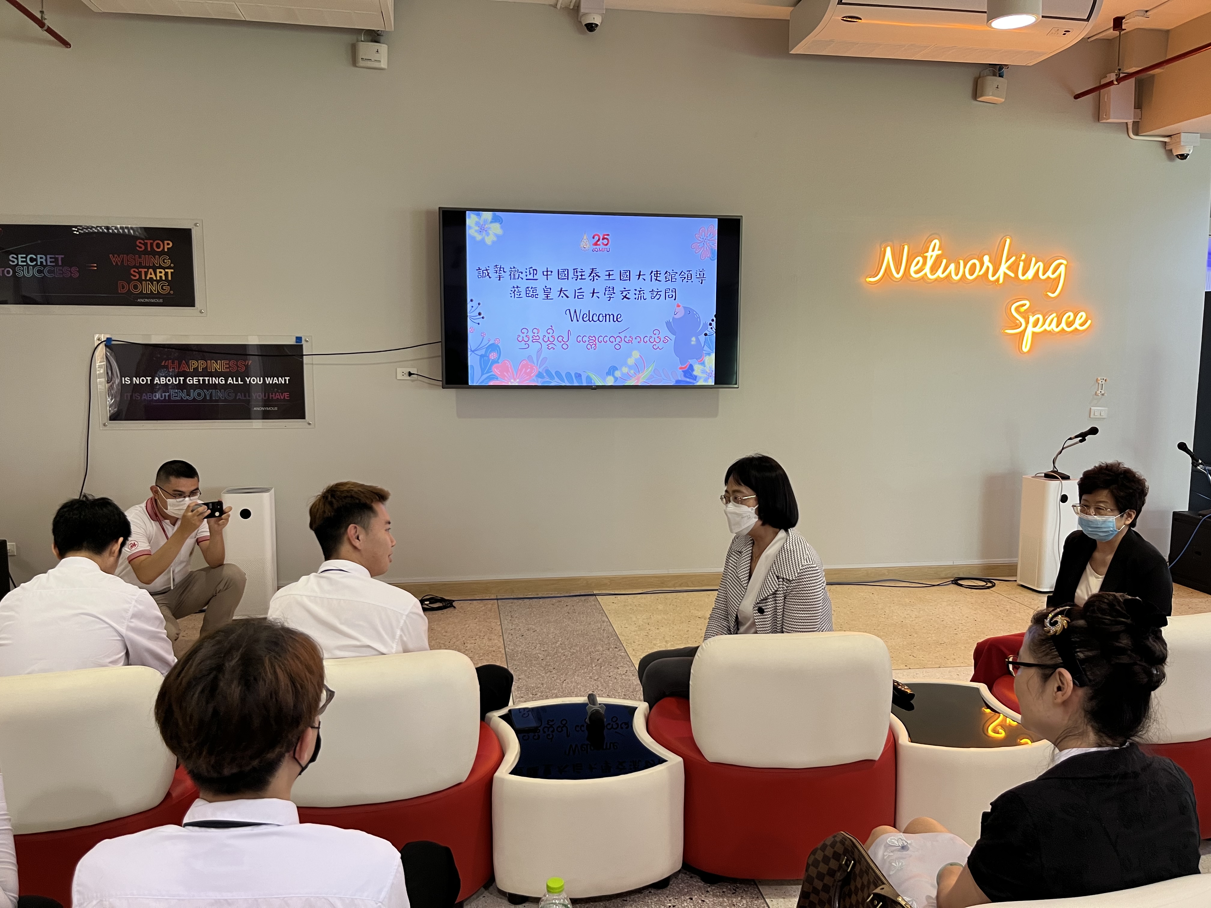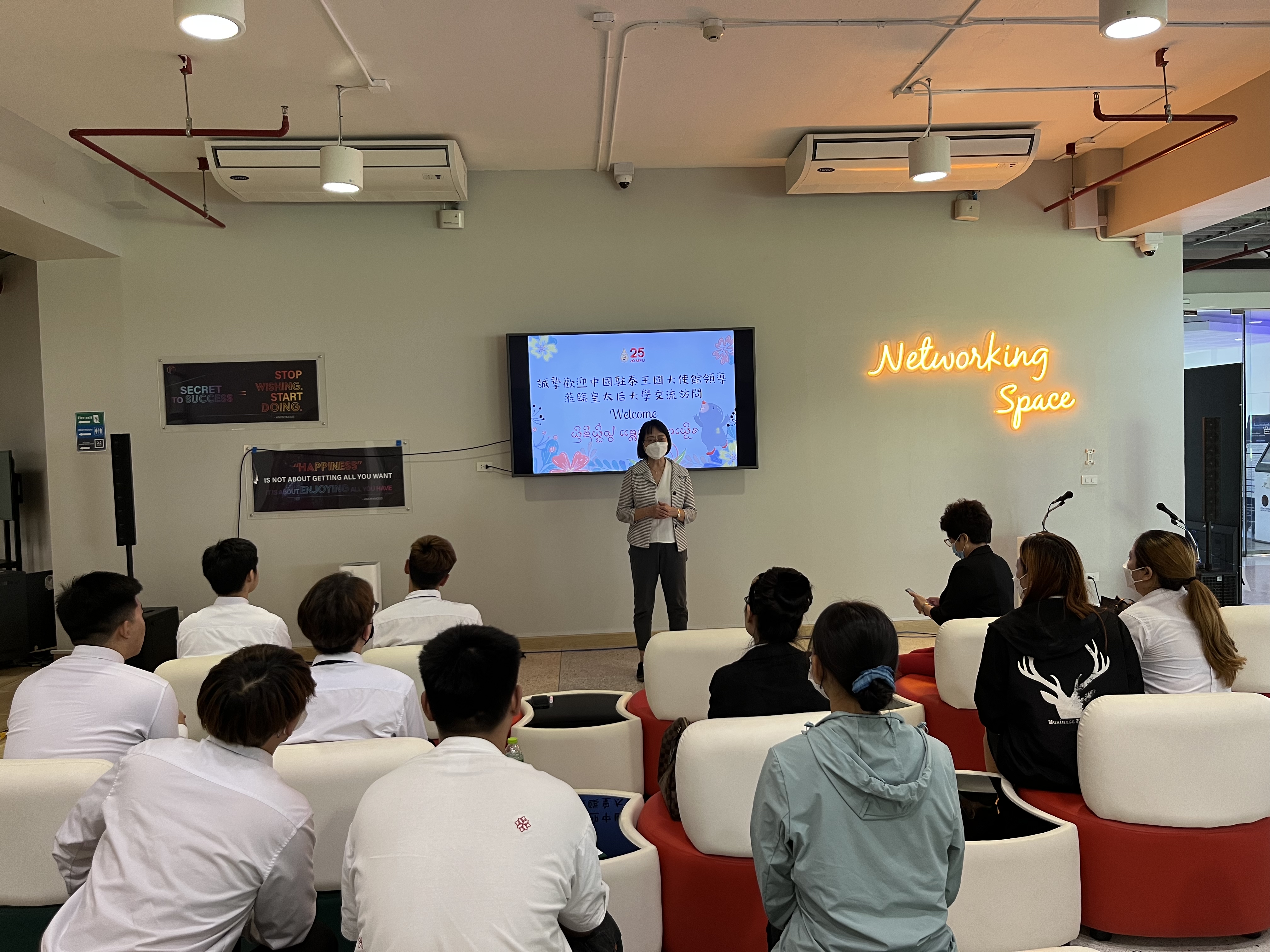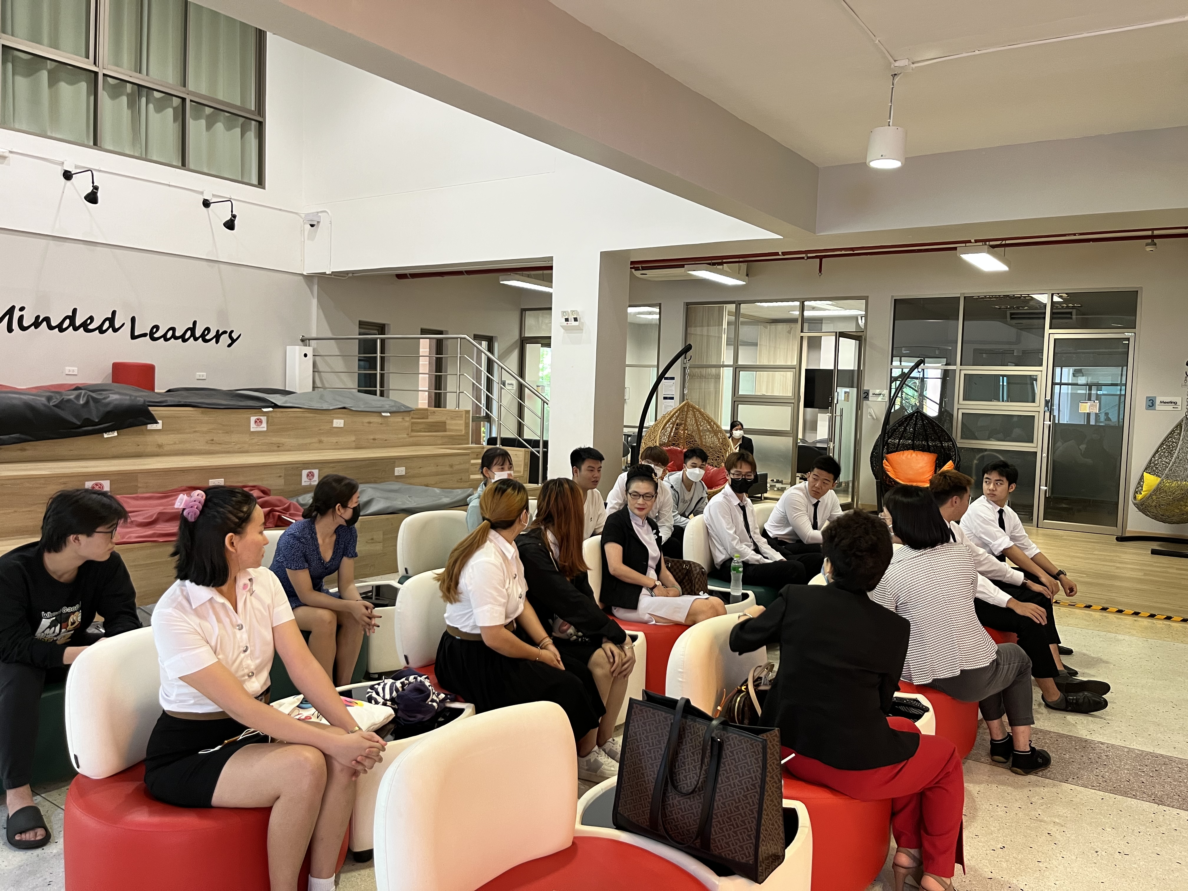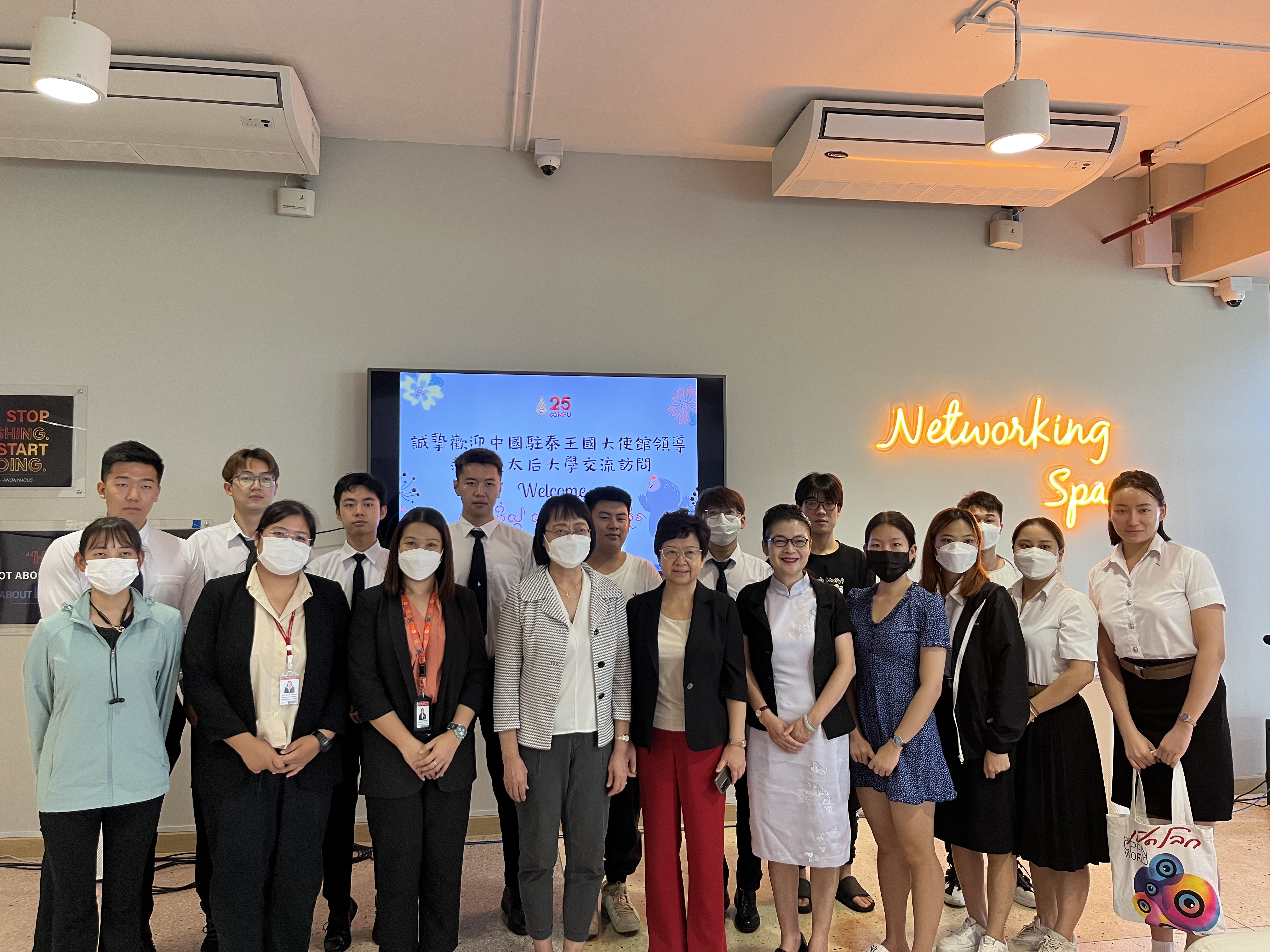 当地时间5月17日上午,中华人民共和国驻泰王国大使馆教育参赞冯俊英、一等秘书王欢、皇太后大学孔子学院院长张桃一行人前往皇太后大学国际处慰问中国留学生。