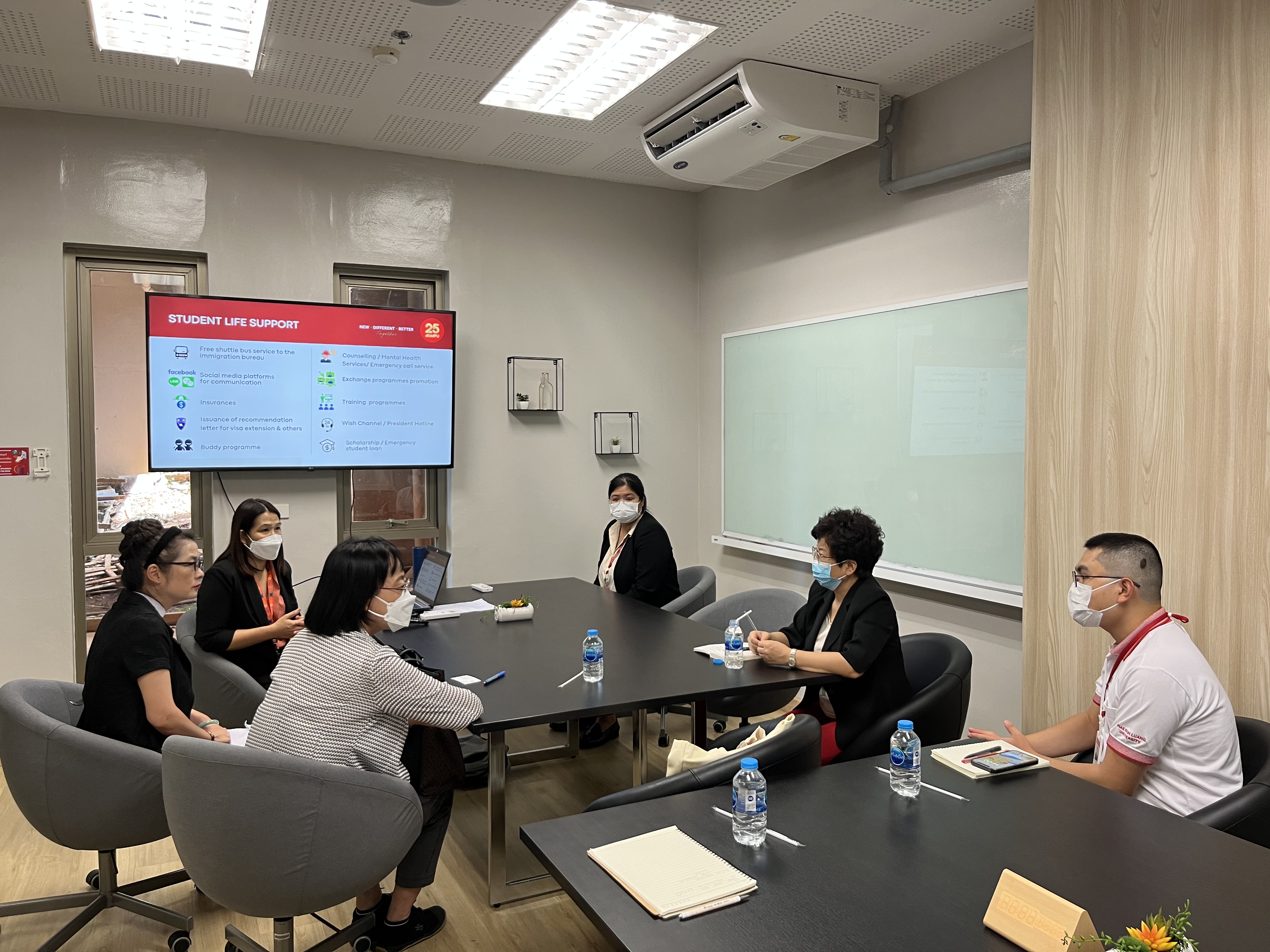 国际处主任MS.Wannapha Thippayasak(左起第二)和行政官员Mr.Xukun Zhang(右起第一)介绍汇报皇太后大学留学生情况
