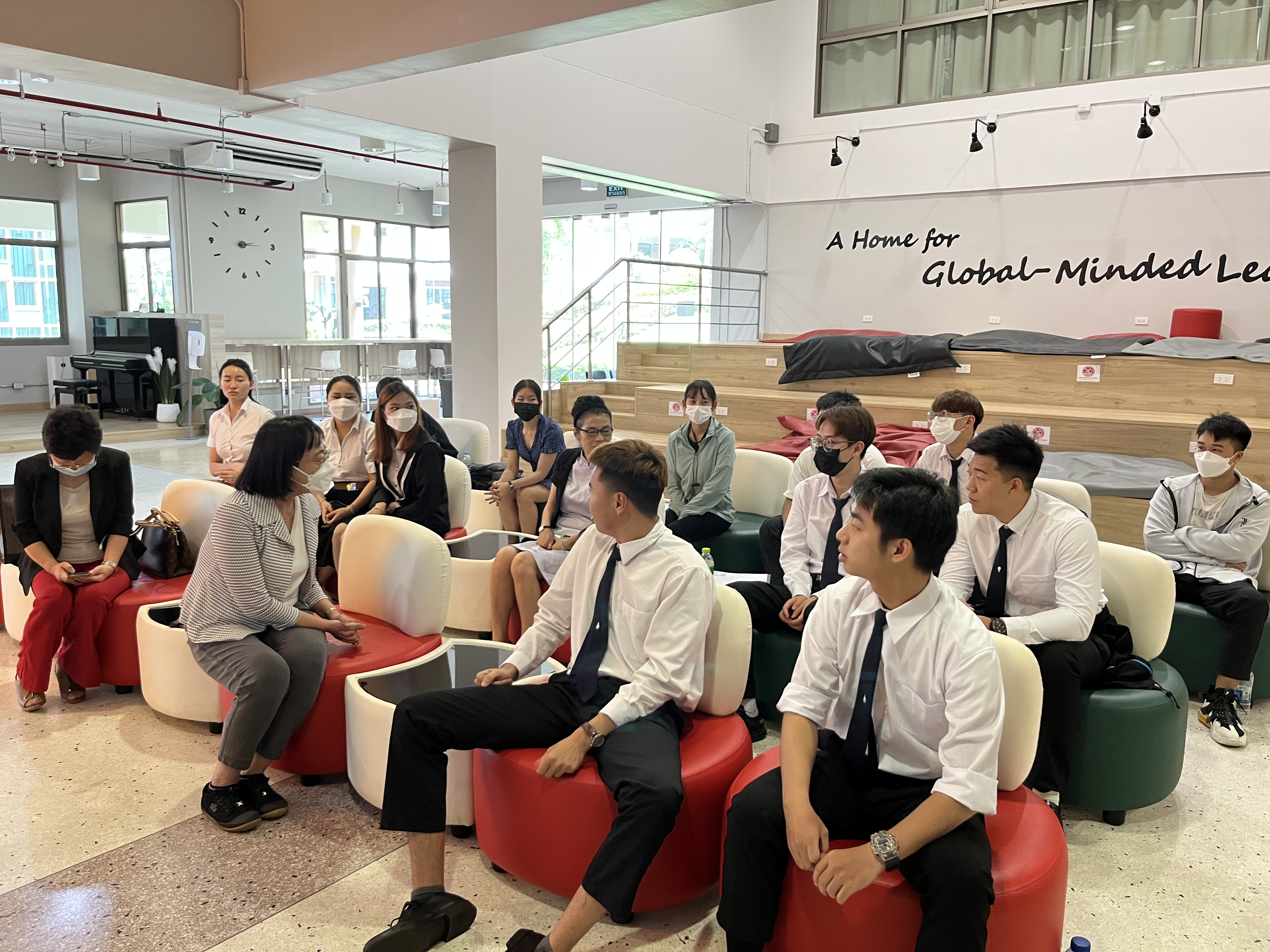 冯俊英一行人与留学生代表进行交流,冯俊英对留学生表达关怀和问候,询问留学生在生活、学习方面遇到的困难,重点强调转线下授课后,泰国治安情况不太稳定,希望在泰留学生保护好自己的人身安全、财产安全,有困难及时寻求老师、学校、使馆的援助。