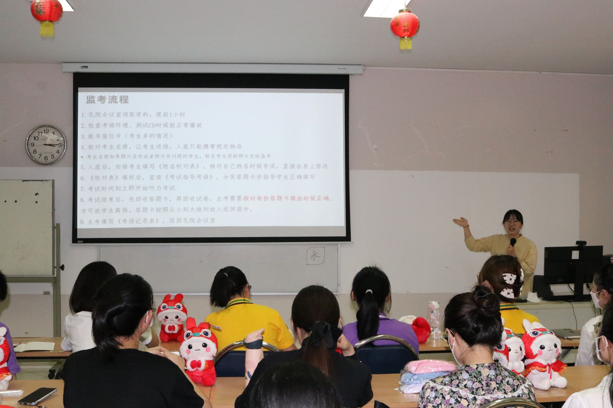 本次考试共有20名监考教师,为了确保考试万无一失,3月16日,陈蕾为监考教师进行了考前培训,详细地讲解了监考的各项要求和考试相关流程,并对考试规则和部分考务调整进行说明,着重培训了HSKK监考操作流程和注意事项。监考老师们各司其职,为监考做好各类熟悉和准备工作,一如既往地遵守考场纪律、熟知考试流程、自觉维护考点信誉。