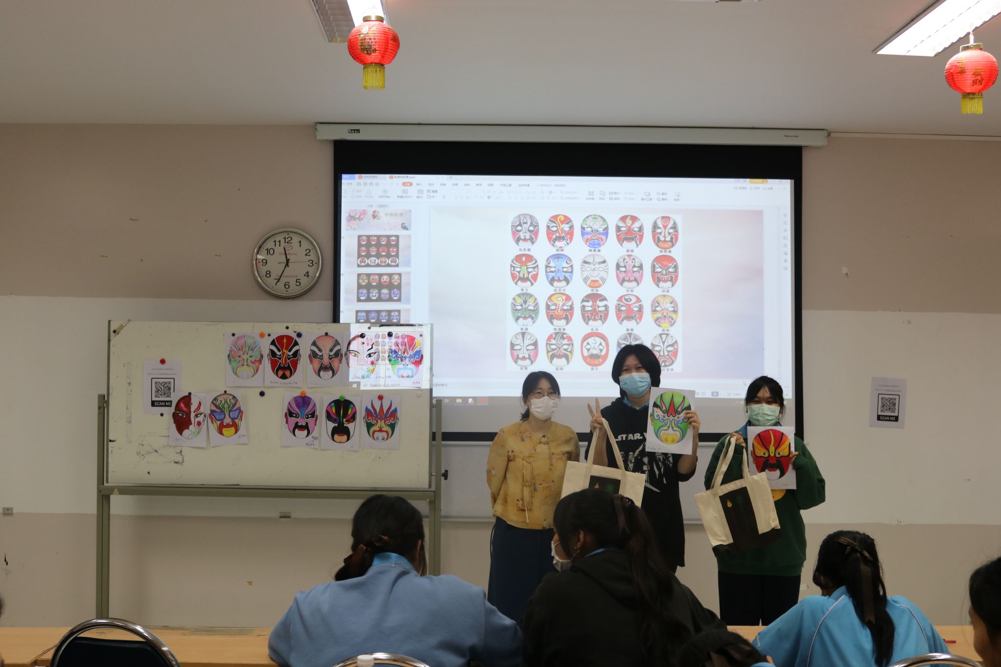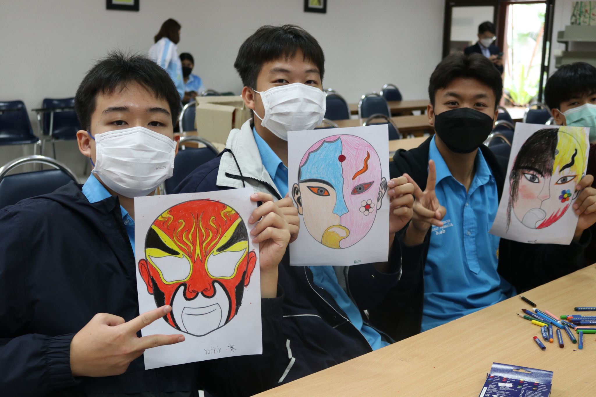 学生展示绘制的脸谱作品