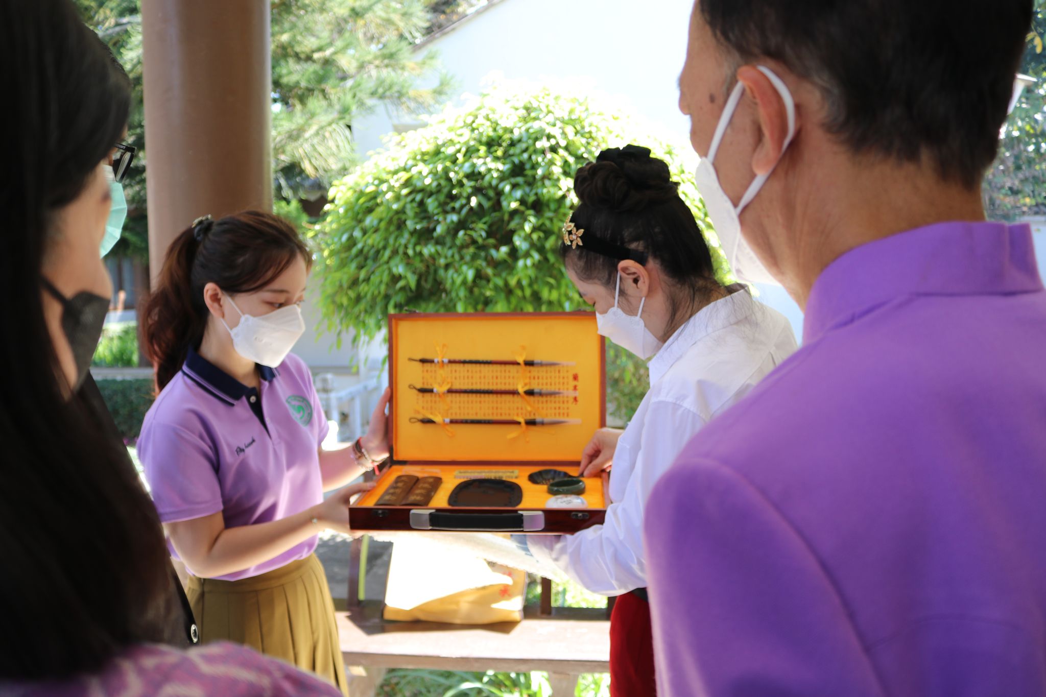 皇太后大学孔院张桃院长(右起第二)向嘉宾介绍文房四宝