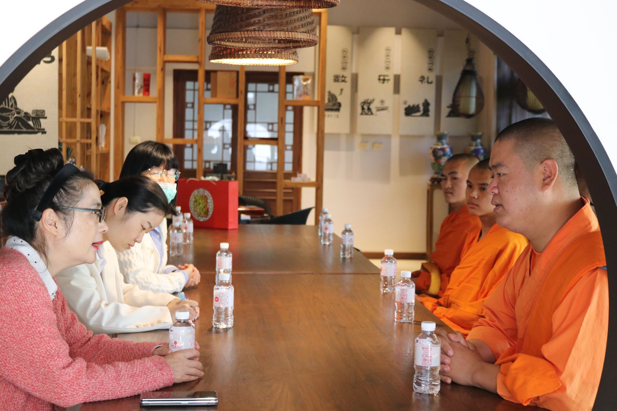 座谈会上双方友好交流,左一为皇太后孔院张桃院长,右一为万佛慈恩寺中学释圣彩师