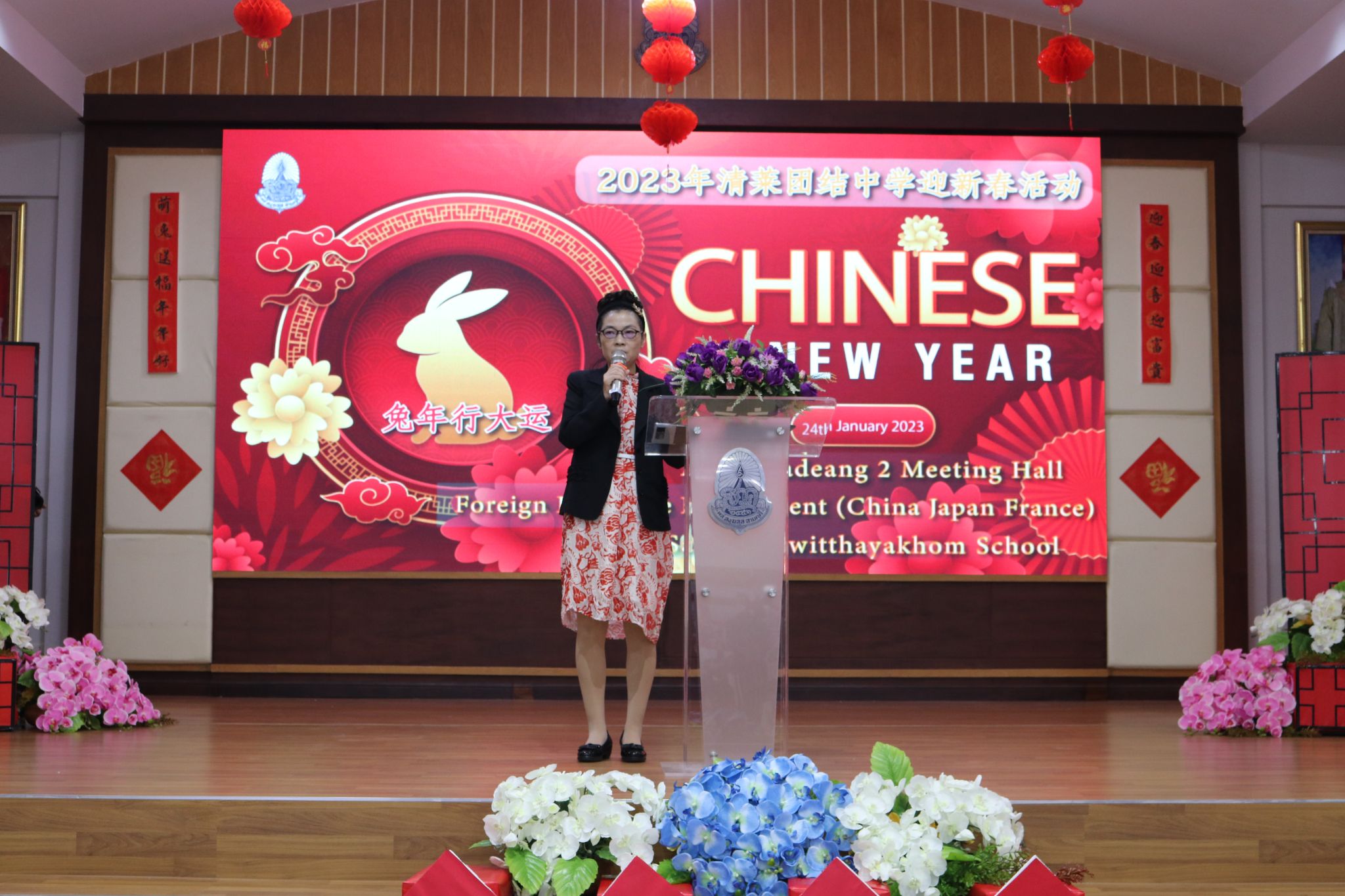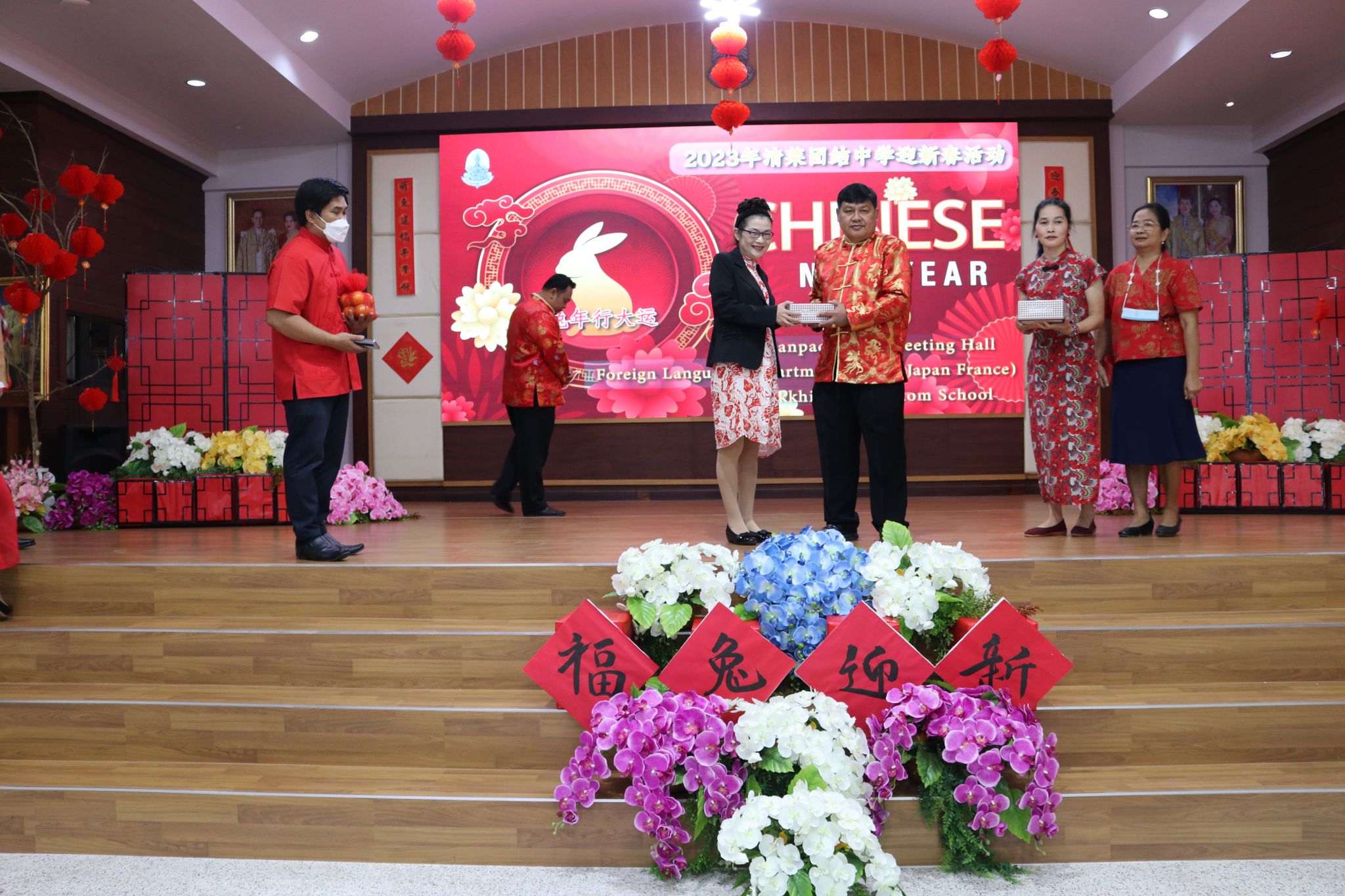上午八点半,活动正式开始。团结中学校长Mr.Charun Kaewpeng致新春贺词。他首先对皇太后大学孔子学院院长和老师们的到来表示热烈的欢迎,对孔院长期以来对教学点团结中学汉语教学和举办中国文化活动方面给予的帮助表示感谢,希望新的一年双方能合作开展更多丰富多彩的文化活动。随后他用泰语向在场的观众绘声绘色地讲述了“兔”的吉祥含义,并向在场的观众送上了节日祝福,“祝大家新春快乐,兔年大吉!”
