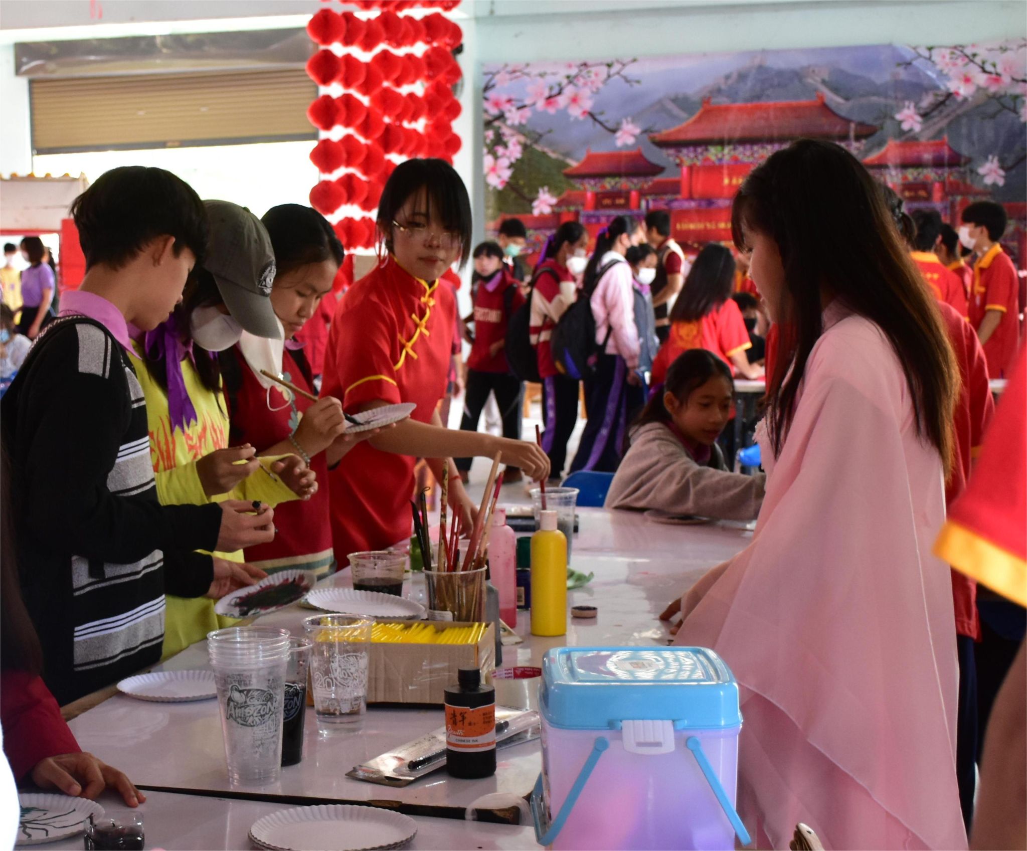 在精彩的歌舞表演之外,此次春节庆祝活动还包括一系列的中国文化体验活动。有一起一落编和谐“中国结”展位,一刀一刻皆是美的“剪纸”展位,一提一转挂团圆的“红灯笼”展位,一笔一画舞乾坤的“书法”展位,一沏一品古香茗的“茶”展位,在场师生可根据自己的兴趣选择喜欢的中国文化活动进行体验。体验活动开始后,各个展位前熙熙攘攘,现场气氛热烈,活动厅内一派新春喜乐之景。