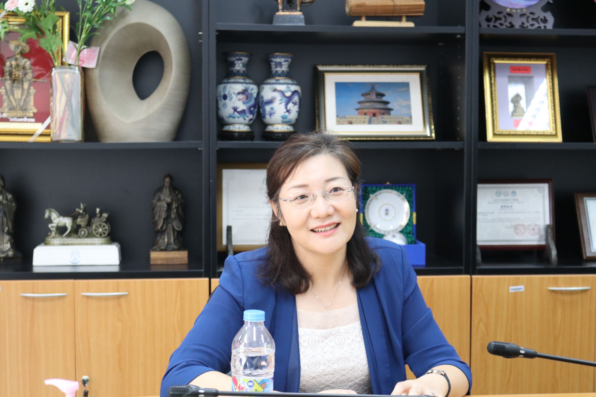 接着,各位嘉宾移步孔院会议室进行了友好座谈。座谈会上,张桃对两位院长的到来表示欢迎,她为泰国疫情放缓各兄弟孔院可以在线下工作交流感到高兴。她提到,曼松德孔子学院和海丝帕纳空孔子学院在汉语教学、文化活动举办、HSK汉语水平考试等方面都各有所长,都值得交流借鉴学习,并盛情邀请两位院长分享经验。