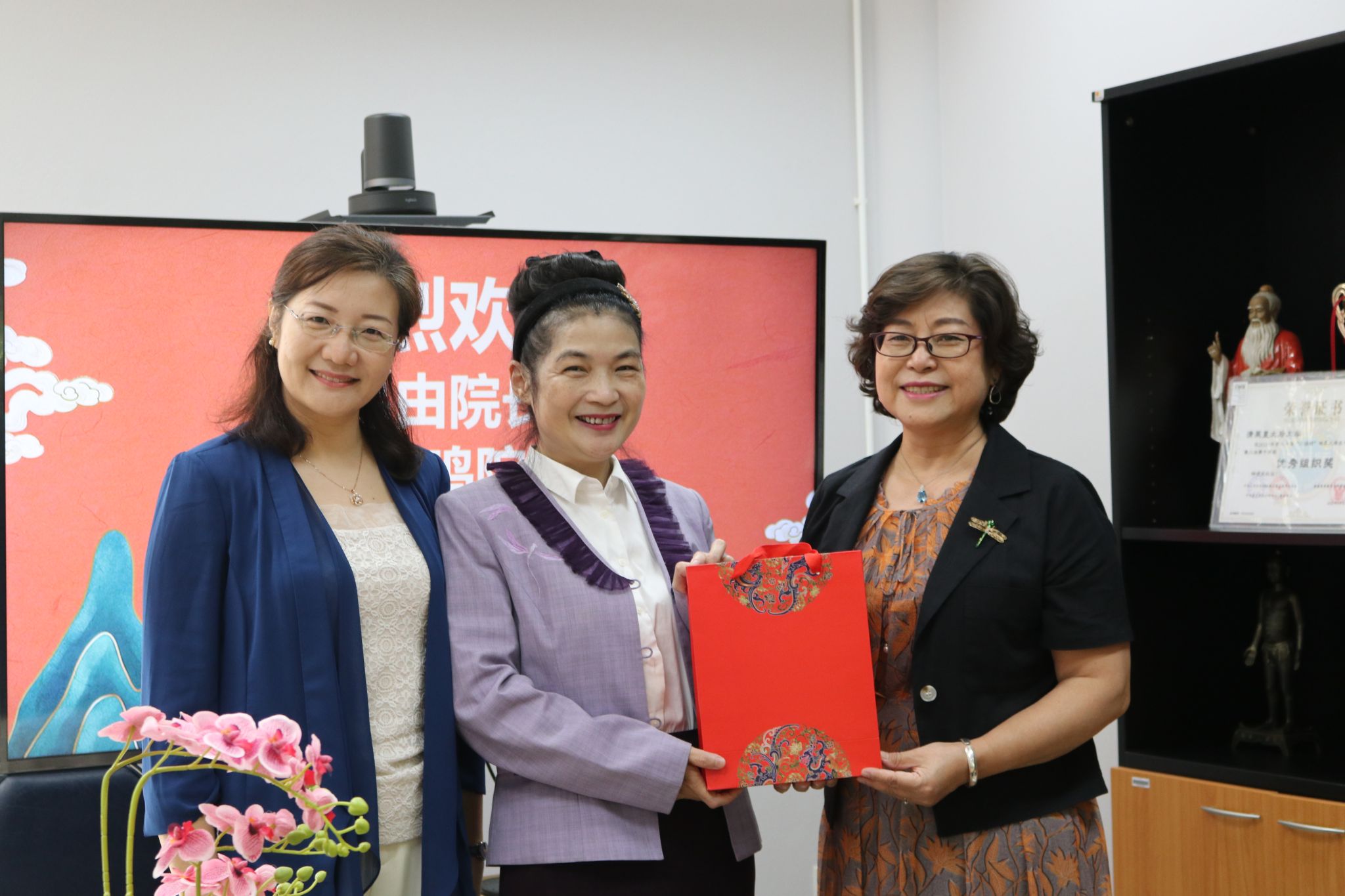 最后,三位院长互赠礼物并合影留念。此次访问,深化了三方孔院的了解和交流,构建了互信、互助的对话平台,为各孔院的发展提供了新思路、打开了新格局。