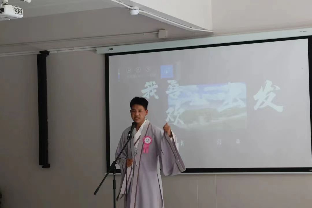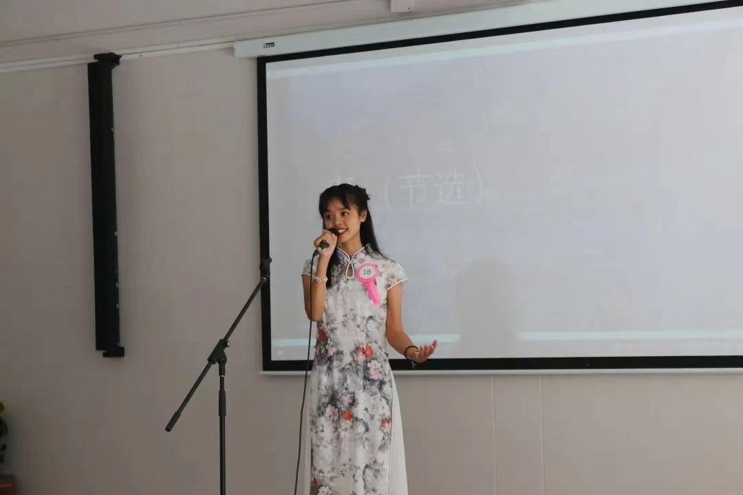 决赛邀请了汉学院陈昌旭院长、岑容林教授、林才均老师等嘉宾评审,其他参赛高校师生都到场为选手们保驾护航,加油助威。在一场清婉悠扬的古筝表演后,第一位参赛选手随之登场,他带来了一首气势豪迈的《沁园春·雪》,只见他从容不迫,伴着音乐,把大家引入了大气磅礴的北国风光,精彩的表现引得现场观众频频拍手称赞。紧接着,如泣如诉的《声声慢》、轻快自由的《面朝大海,春暖花开》、旷达超脱的《水调歌头》、铿锵有力的《少年中国说》、深情浪漫的《致橡树》等,或今或古,抑扬顿挫,情真意切,现场气氛一波高过一波,引人入胜。
