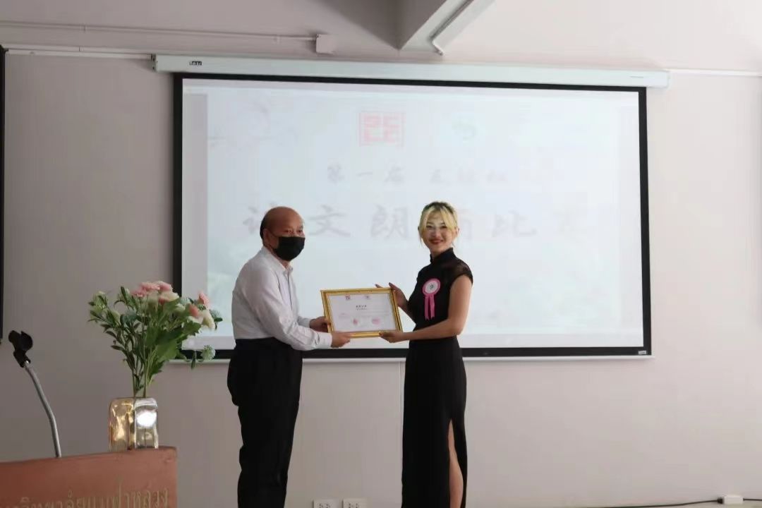 最终,20位参赛选手经过激烈角逐,优中选优,晏彩思(Siriphorn Kowarakun)凭借慷慨激昂的《木兰辞》荣获一等奖,姜祥月(Thanaporn Aokham)获得了二等奖,张益荣(Sirikhwan Lijan)获得三等奖。有五位选手获得优秀奖,其他选手也都荣获参与奖。
