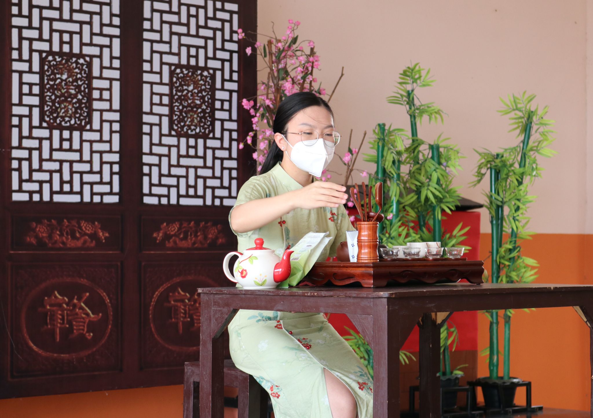 舞狮表演结束后,由孔院志愿者教师欧阳希老师为全体师生带来了中国茶文化的展示。伴随着悠扬婉转的旋律,欧阳老师用熟练的手法为全体师生展示了不同茶叶的不同冲泡方式,并热情邀请现场师生小口啜饮,品味茶香。