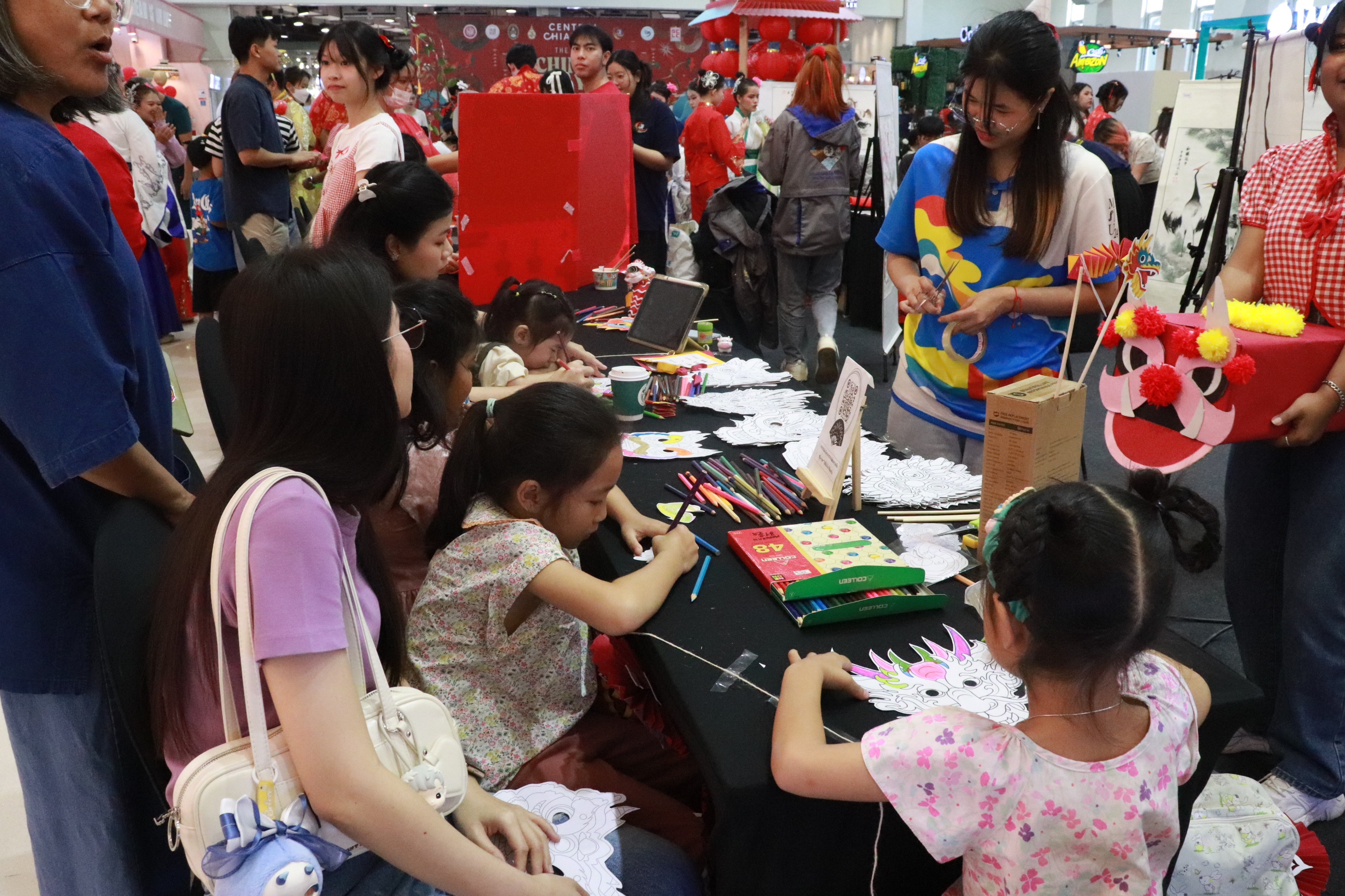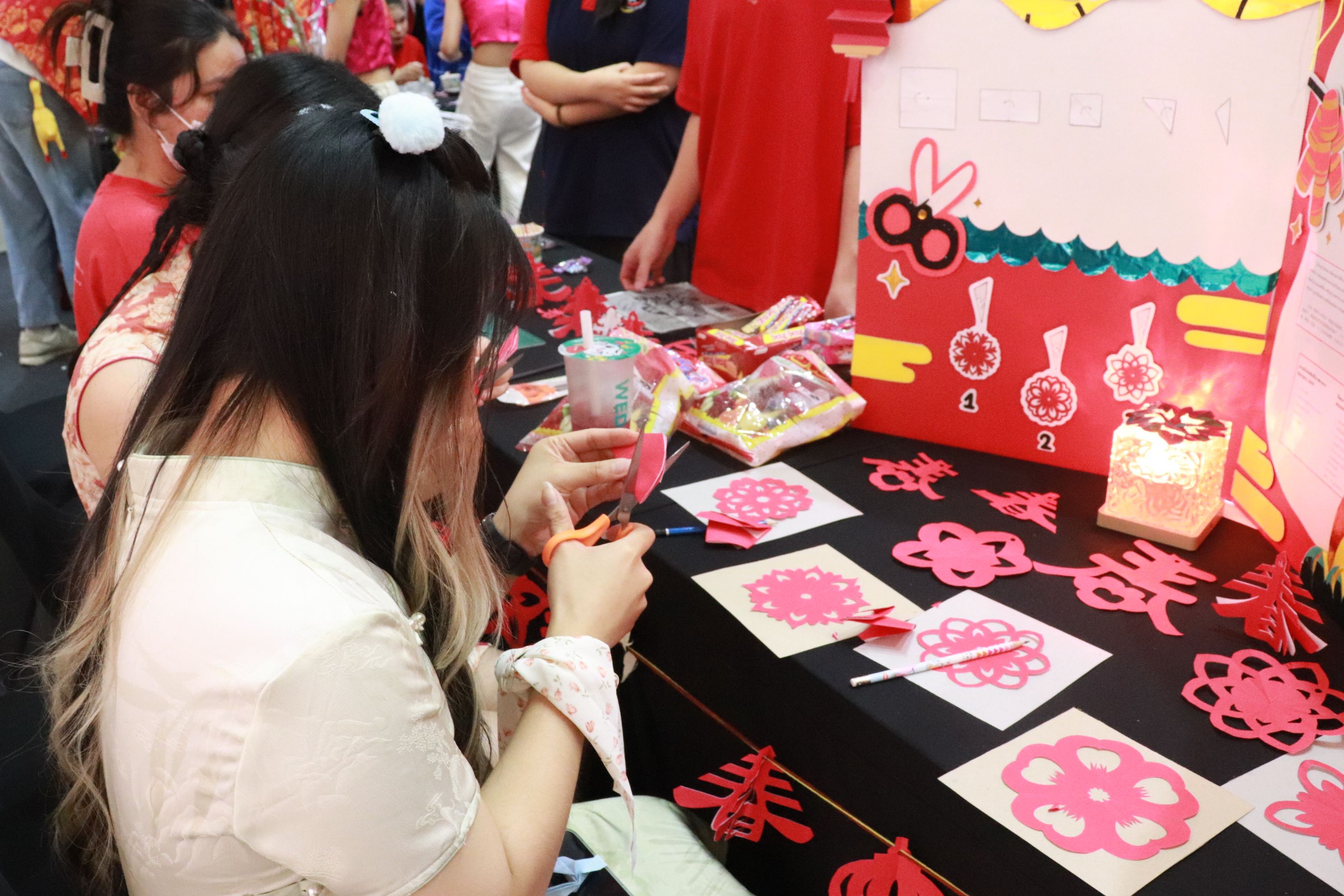 文化节现场还同步举办了2025年春节中华传统文化展,皇太后大学师生们精心策划布置了七个特色展区,包括舞龙舞狮、剪纸、灯笼、求签叠纸、中国结、香包和长寿面等,让来宾在互动中感受中国春节的独特魅力。学生们展示了精美的剪纸作品,并现场示范剪纸技艺,吸引了许多人动手尝试,感受传统艺术的精巧与趣味。
