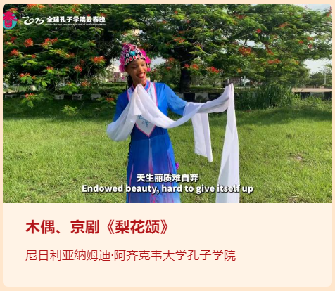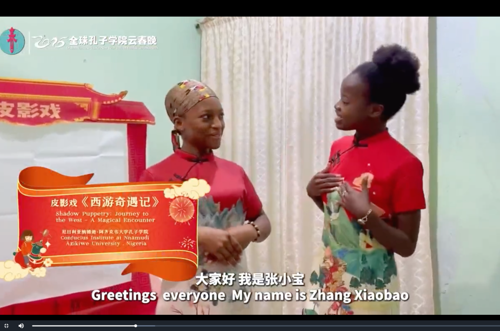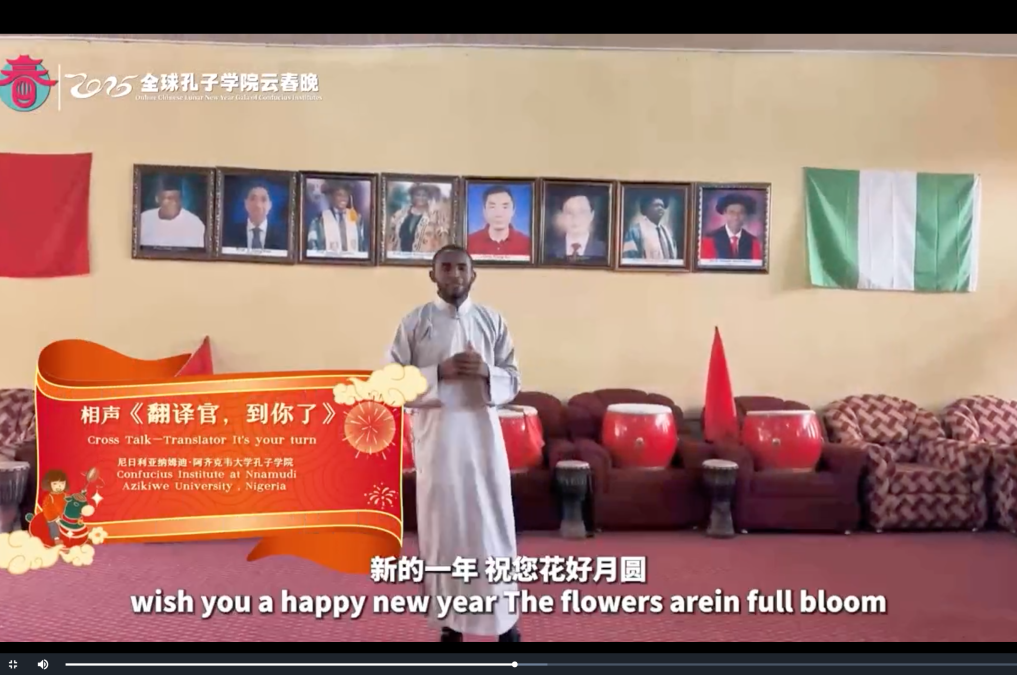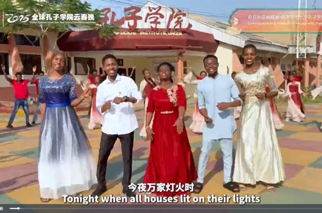 2025全球云春晚在100多所孔子学院(课堂)选出150个优秀节目在平台进行展映,为全球观众提供多元化的文化体验,其中亚洲42个,欧洲40个,美洲大洋洲15个,非洲53个。我校尼日利亚纳姆迪·阿齐克韦大学孔院5个节目荣登展映列表,分别是:《新春祝福》、金瑞森IFECHUKWUDE HARRISON等《威风锣鼓》、周文静ZHOU BETTY SHUN-CHANG相声快板《话孔子》、齐斯恒BENJAMIN FAVOUR CHIDERA木偶、京剧《梨花颂》、穆妍MOSES AYOBAMI LOVELEEN等原创歌曲《绿色梦》。