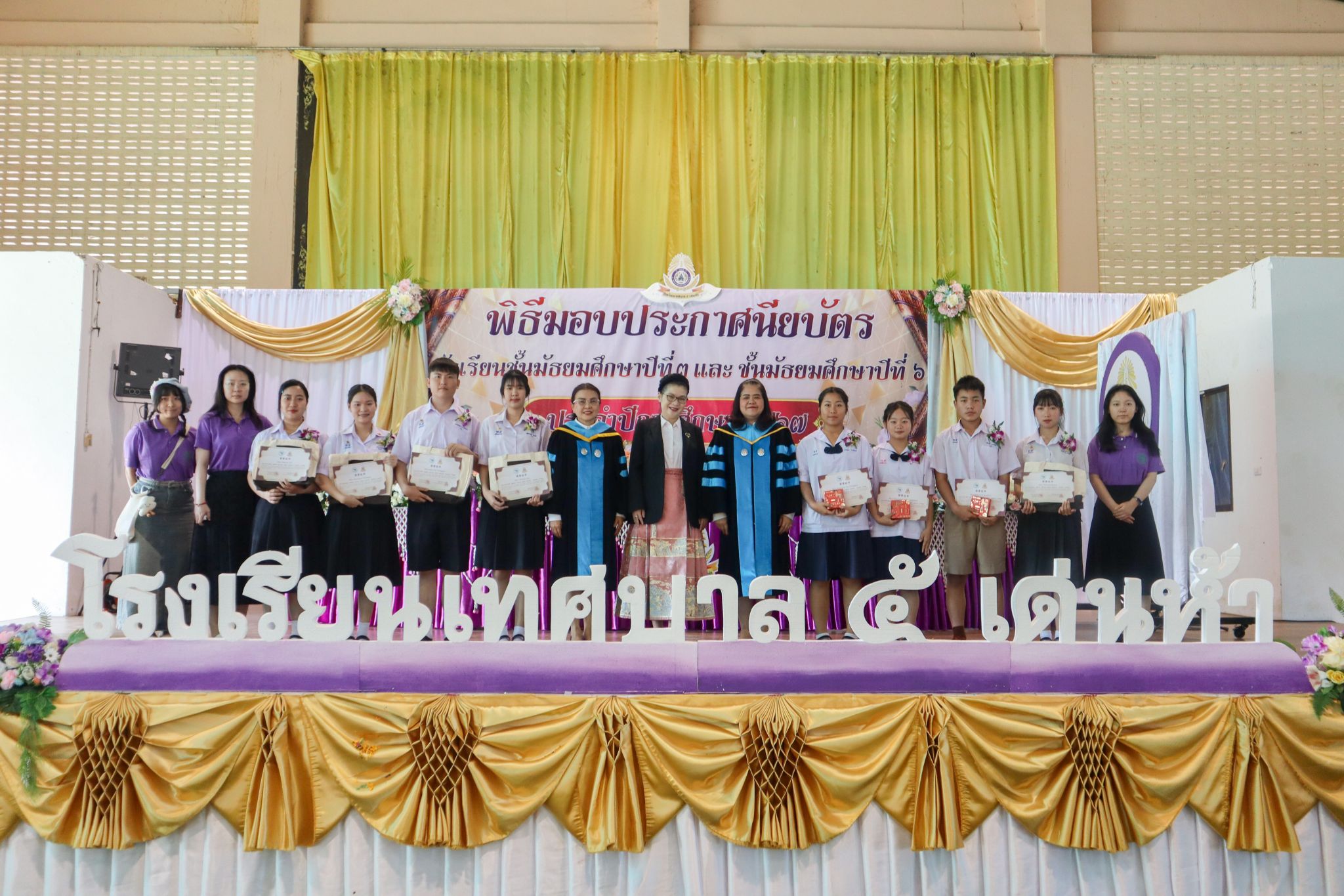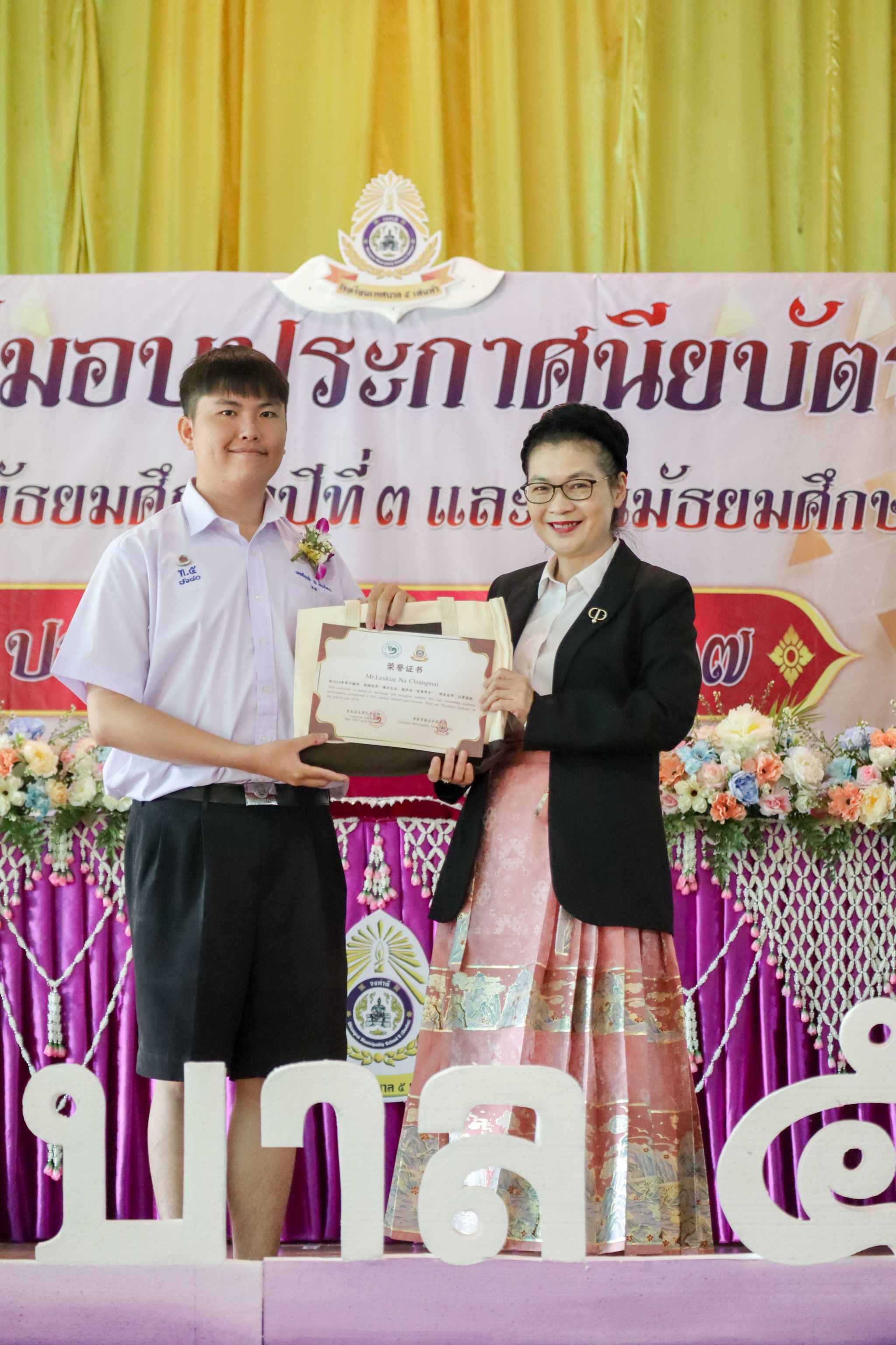 张桃分别为初三和高三的优秀毕业生颁发证书和奖品,并为在2024年第三届厦门大学“慧识中国”国际学生中文应用大赛获奖的学生进行颁奖。作为皇太后大学孔子学院重要教学点,清莱五中一向重视中文教育,涌现出不少在各方面表现突出、成绩优异的学生。在此次“慧识中国”应用大赛中,清莱五中积极组织学生参赛,马秋鸿同学的《携手汉语,筑梦未来》、黄佩霜同学的《奋斗成就新时代》荣获演讲比赛优秀奖,黄㑣斐同学的作品获得了硬笔书法优秀奖。