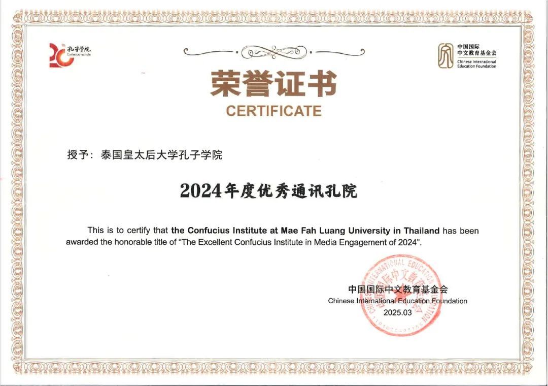 近日,泰国皇太后大学孔子学院凭借出色的新闻宣传工作,再次荣获“2024年度优秀通讯孔院”称号。该奖项由中国国际中文教育基金会评选,从全球499所孔子学院中遴选出61所表现突出的单位,皇太后大学孔院连续两年获此殊荣。此项殊荣不仅体现了孔院在信息报道和文化传播方面持续深耕的成果,也进一步肯定了孔院在推动海外中文教育、促进中泰学术合作与文化交流中的重要作用。