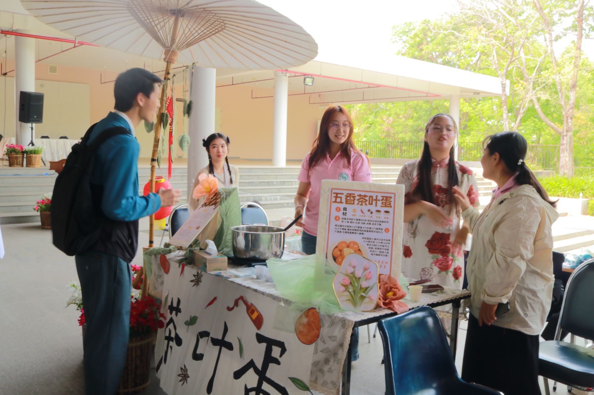 中泰美食节现场设置了十余个特色美食展位,供师生们品尝与体验。泰式传统甜点露楚、香辣浓郁的绿咖喱鸡米粉、酥脆可口的春卷、香气四溢的茶叶蛋等美食琳琅满目,令人垂涎。展位区人头攒动,师生们兴致勃勃地穿梭其中,或驻足品尝,或拍照留念。每个展位不仅提供美食,还特别设置了文化介绍,详细讲解各类美食的历史渊源、地域特色及其背后的文化故事,让大家在品尝了美食的同时,也增长了知识,获得了身心的双重愉悦。