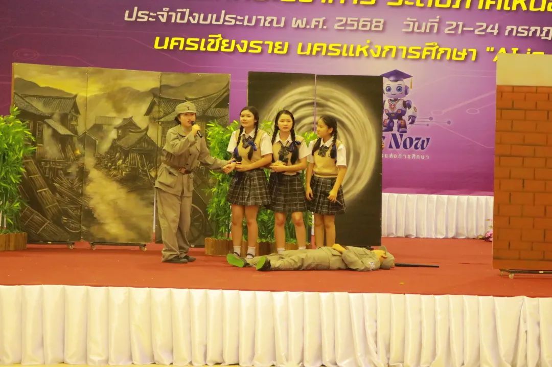 初中组冠军清莱六中初中部的精彩剧目《历史的回声》带领观众穿越到中国古代,与花木兰相遇,见证了中国人民抗日战争的伟大历程,并展望了充满科技感的未来。
