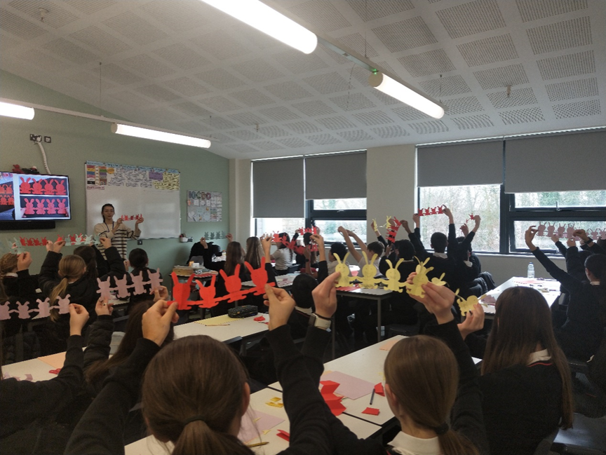 雷雪婷在本次活动中给学生带来了趣味十足的中国剪纸课程。一开始,雷雪婷提问中国春节有哪些习俗,学生们纷纷踊跃回答,放烟花、发红包、包饺子、贴春联等,可以看出大家都对中国春节都有着一定了解,于是,雷雪婷顺势简单介绍了中国新年贴窗花的习俗,告诉学生剪纸在中国是一项历史悠久,受人喜爱的手工艺术。然后询问大家,是否知道今年是什么年?学生们一齐回答:“兔年!”,“非常好,今天,让我们一起剪可爱的小兔子!”。看着屏幕上萌趣可爱的小兔子剪纸,学生们兴奋不已,跃跃欲试。一旁的英国管理教师也微笑着拿起彩纸加入了课堂。