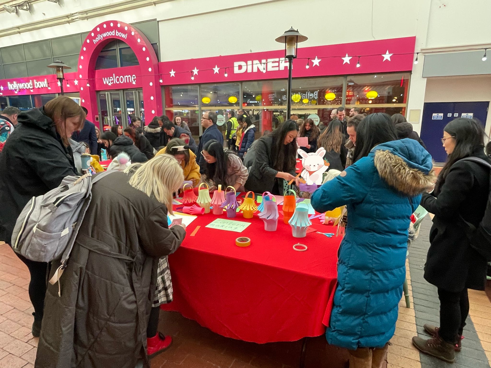 阮晶晶和何玲负责的活动是中国灯笼制作。两位老师准备了彩纸、剪刀、胶水等材料和工具,并与其他工作人员提前制作了五颜六色的灯笼样品。老师们为当地民众讲解了新年的习俗和灯笼的历史,手把手教大家设计和制作灯笼。到场的孩子们均沉浸在灯笼手工制作中,活动现场充满了热闹喜悦的气氛。活动结束后,大家纷纷把灯笼带回家作为纪念品,并表示期待卡迪夫孔院进一步走进当地中小学宣传中华文化。