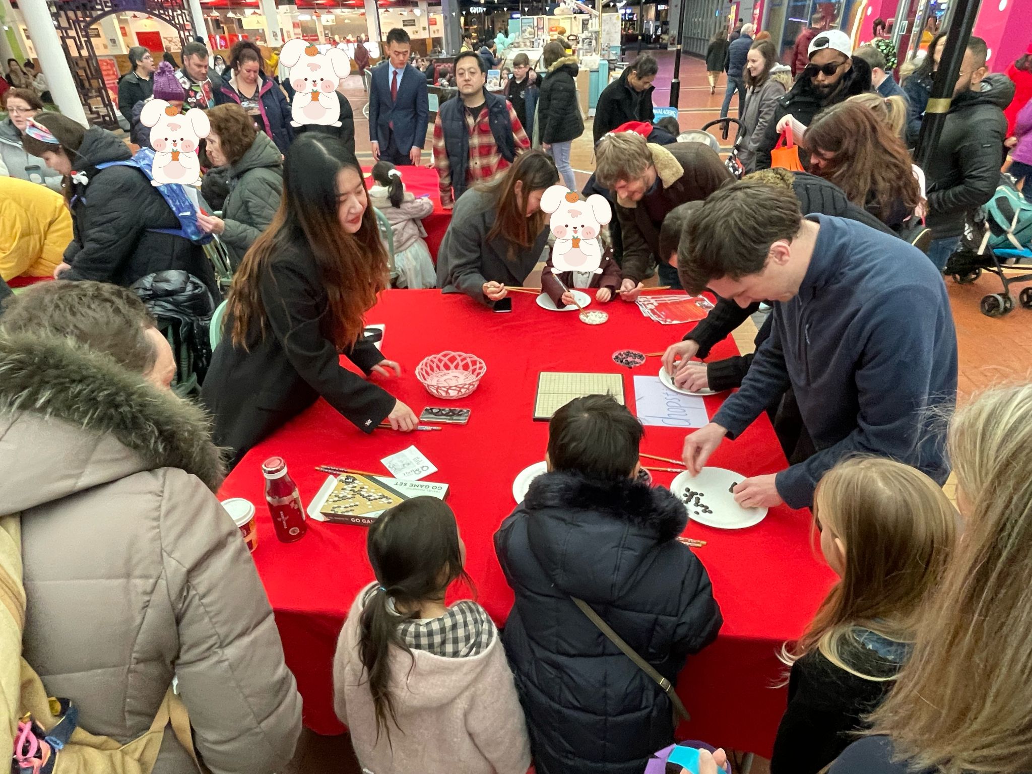 郝堃与雷雪婷负责书法体验活动。两位老师提前准备了笔墨纸砚,书法集等材料。本次活动吸引了数百人的参与,参与者对书法汉字非常感兴趣,充满好奇,每一位参与者都会指着汉字问“这是什么意思”?老师们也不厌其烦地解释,并分享了一些常用的新年祝福语,比如“大吉大利”、“新年快乐”,还有各种各样的“福”字。加入兔年的元素,让福字也变得可爱起来。一位参与者说:“汉字真有趣,和西方的字母体系完全不一样,你能从中体会到不同的思维方式”,另一位参与者说:“汉字很神奇又很神秘,我一直对它很感兴趣,希望有机会深入学习它”,还有的参与者直接咨询中文课程。大家纷纷表示活动内容精彩实用,体验了一次别开生面的春节活动!
