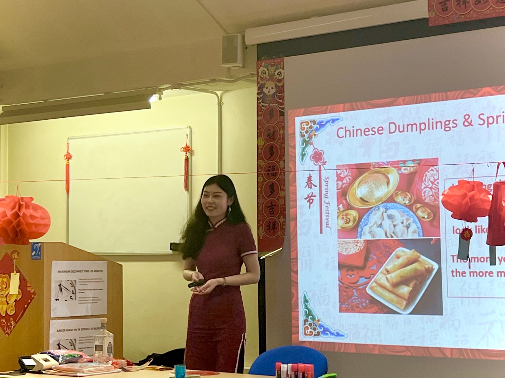 活动伊始,何玲系统介绍了中国新年的起源,传承以及相关习俗。春节承载着上古时代岁首祭祀、敬天法祖的文化底蕴,让英国友人领略到春节背后悠久的历史文化内涵;对新年庆祝活动如除旧布新、驱邪攘灾、拜神祭祖、休闲娱乐等内容的详细讲解,展示了中华民族的思想信仰、理想愿望和生活文化;对饺子、元宵等春节食品的解说则揭示了春节饮食文化超越物质、化实物为美好期盼的象征意义。