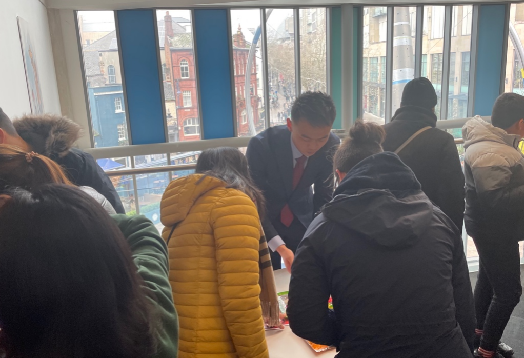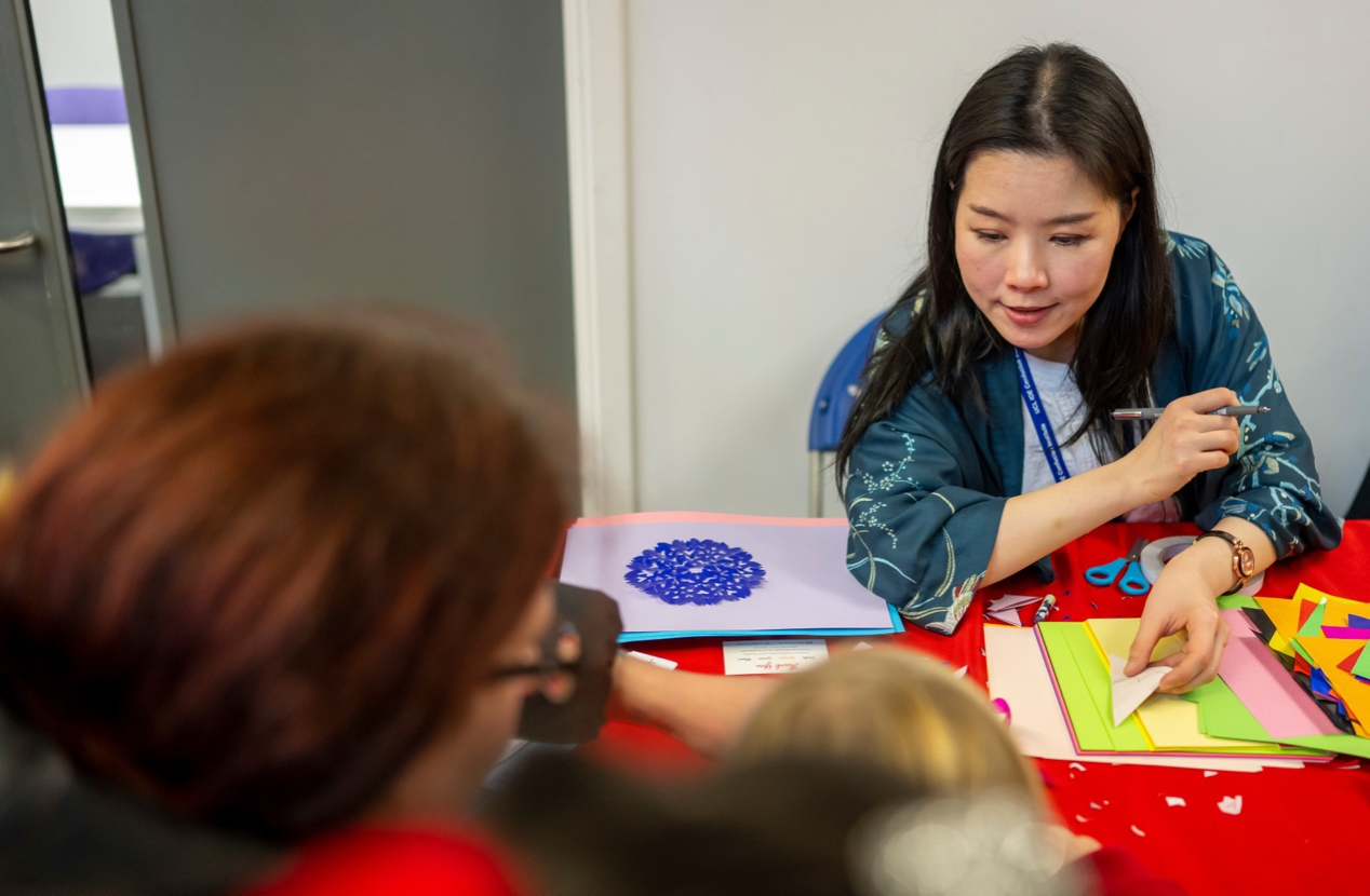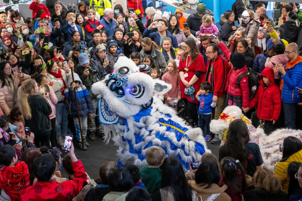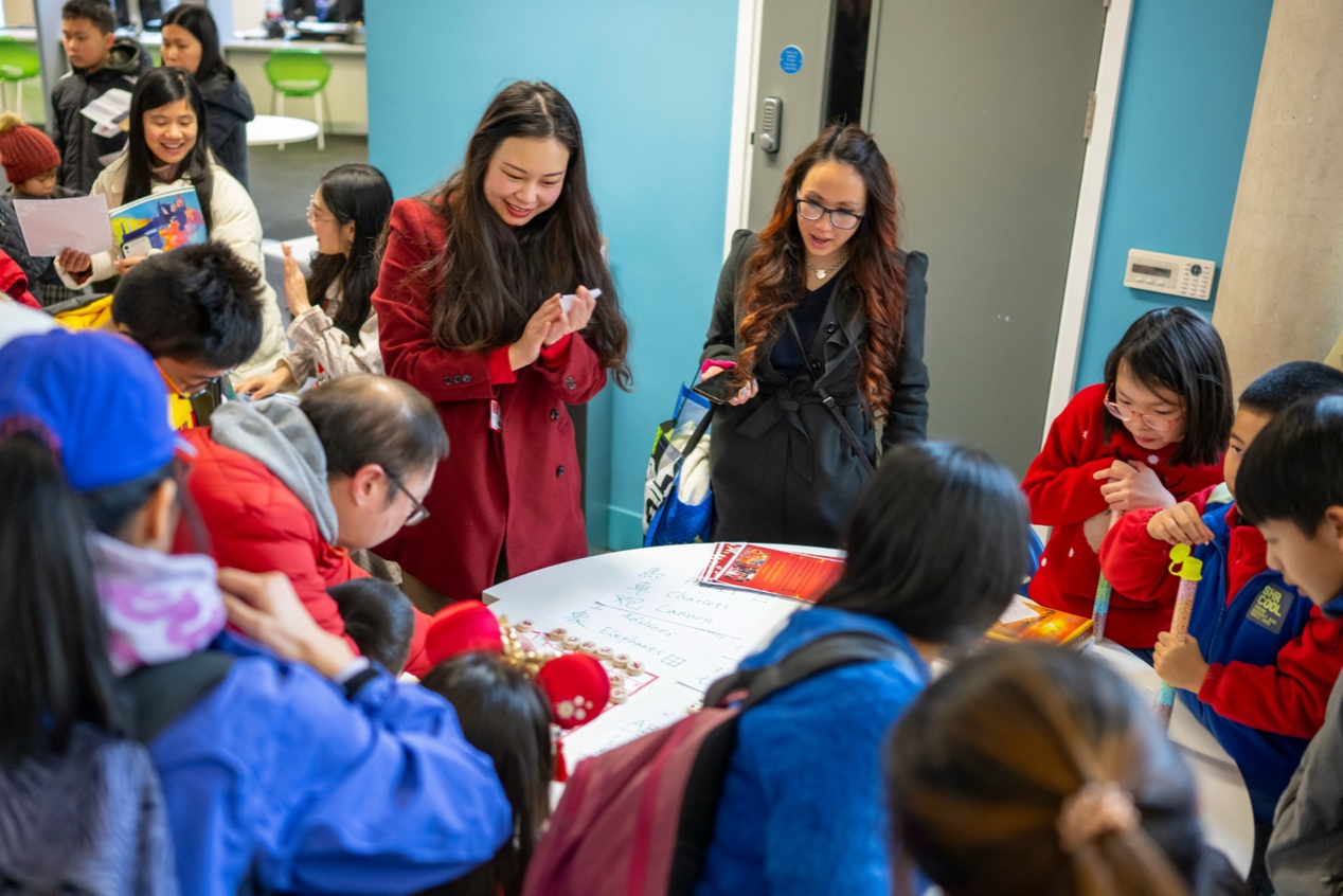 当地时间1月21日,卡迪夫大学孔子学院全体员工协助市图书馆开展了中国新春系列活动。本次活动于10月初开始筹备,当地时间10月14日卡迪夫孔子学院文化活动负责人唐玮与卡迪夫中央图书馆负责人佩蒂(Preeti)女士开展第一次组织策划会。由唐玮采购活动所需物资,联系表演人员。活动从雏形初现到最后落实期间的四个月,每个工作周都在不断创新想法、更新进度。为了鼓励市民们踊跃体验不同的文化活动,了解十二生肖,他们设置了集齐六个不同的生肖贴纸就可以换购小礼物的活动机制。为更好呈现新春氛围,孔子学院请来专业的舞狮团队给市民们表演,同时还请工作人员穿上了财神的衣服为小朋友们派发装有巧克力金币的红包。春节的前一周,卡迪夫孔子学院公派教师郝堃、唐玮,志愿者邓诗懿、付永平、雷雪婷与图书馆工作人员一起完成了会场布置。图书馆四面的落地窗都贴上了窗花,门口贴着金色的对联和财神爷,灯笼、中国结和锦鲤挂饰悬挂在中庭的空中,更为图书馆增添了新春色彩,也吸引了市民走进图书馆了解春节庆祝活动。