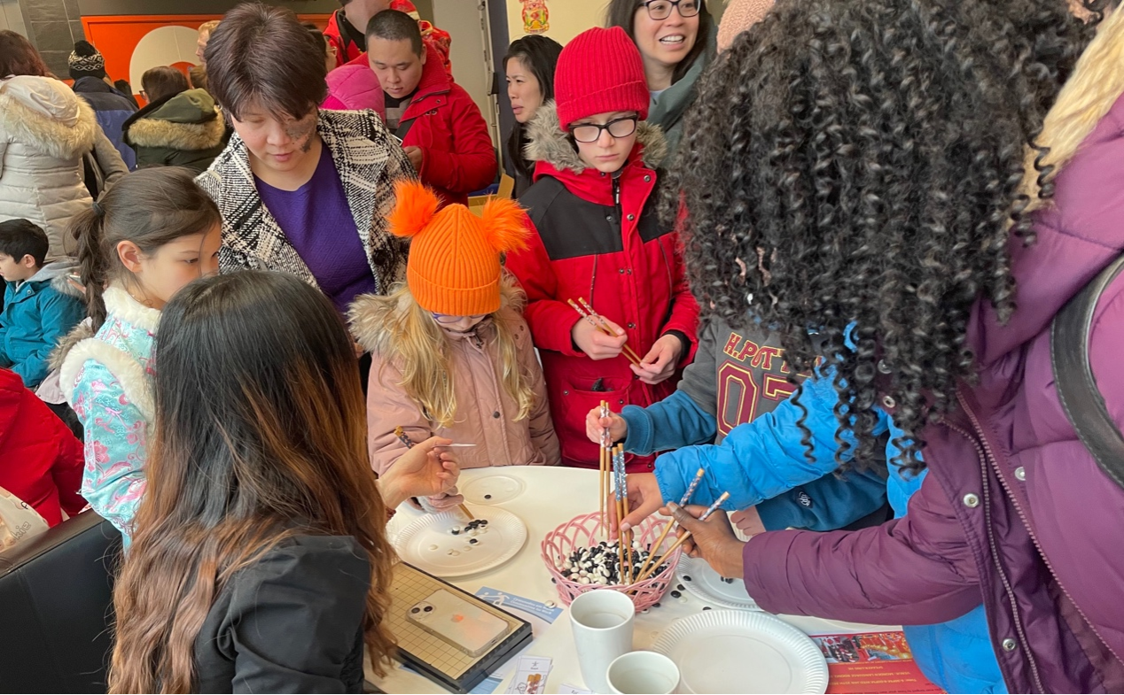 在筷子游戏活动中,张琪准备了多双筷子和五子棋,主要让前来参加活动的本地市民们体验如果正确使用筷子。首先张琪向市民们演示使用筷子的正确方式,接着让他们练习夹A4纸等比较轻的物品,最后让他们尝试夹五子棋并两两一组进行比赛。在学习使用筷子的过程中,刚开始许多市民表示有一定难度,但稍加练习之后则渐渐熟练起来。最后许多小朋友及家长都加入到挑战夹五子棋环节,当他们几经周折终于夹到第一颗五子棋的时候都激动地发出惊呼声:“I got one!”“I did it!” 场面十分热闹。最后张琪表示,用筷子夹五子棋确实是比较有挑战的一件事,但如果他们可以夹到五子棋以后一定能用筷子更好地享受中国食物。许多市民也表示这个活动有些难但非常有意思,对于终于学会使用筷子这件事也感到非常兴奋!