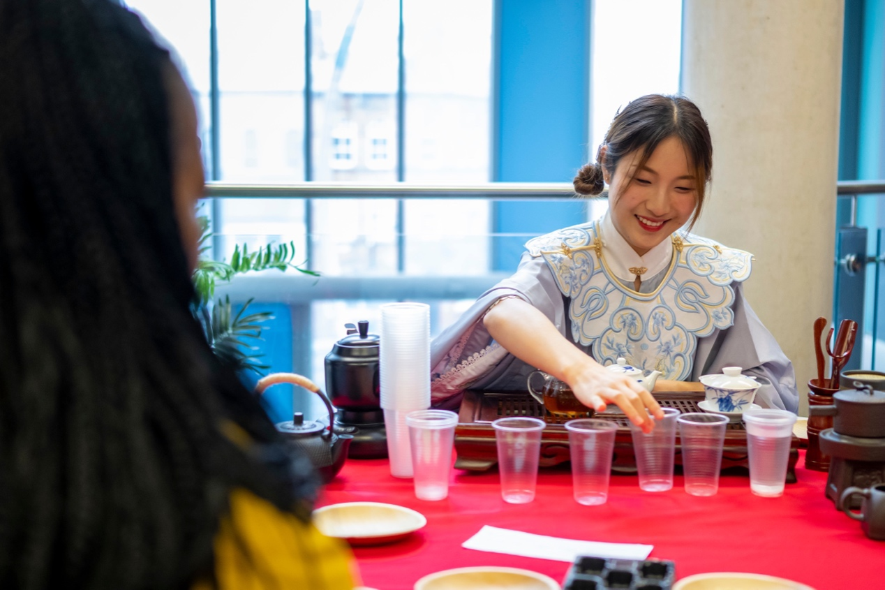 付永平负责的是茶艺与品茶板块。本次品茶活动准备了三种茶,分别是绿茶、白茶和普洱茶以及对应的点心。中国的茶叶与英国的茶包有很大的不同,这也是活动参与者对这一板块感兴趣的原因。很多来参与品茶的人都很喜欢白茶,因为白茶品起来略甜,更适合英国人喝茶加糖的口味。有一位来自英国的朋友主动在品茶过程中向大家讲述了中国茶叶的历史和传说,并分享自己在中国旅行与品茶的经历。还有很多茶叶爱好者询问这次活动的茶叶有哪些购买渠道,决定自己也买中国茶叶闲时品一品。
