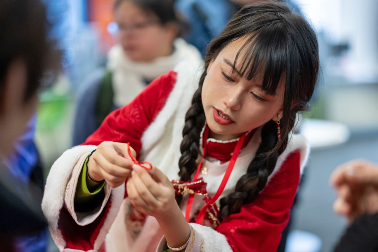 书法和中国结体验是当天尤为火爆的项目之一。由学生先练习书法汉字,然后在红色卡纸上完成书法作品,再到唐玮负责的中国结摊位制作中国结,并穿在写着新年吉祥话的红色卡纸上。许多市民都聚集在书法和中国结的摊位,可谓是“里三层,外三层”,可见他们对中国文化的热情。在中国结的展位上有一对母女齐心协力编好了一个中国结,在妈妈学不会想放弃的时候,女儿主动地捏着绳子的三个“小耳朵”让妈妈更容易腾出手操作。编好后,妈妈激动地抱着女儿亲吻,女儿也拿着小中国结在空中挥舞着。大家都很喜欢书法卡片+中国结挂件的形式,并给予郝堃、唐玮两位高度评价。