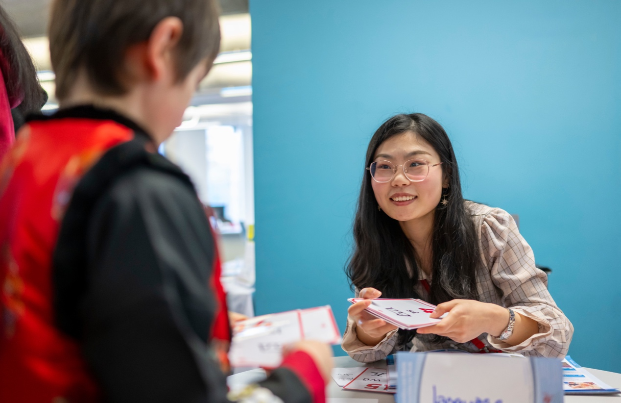 汉语试听活动也吸引了相当多的参与者,何玲介绍了一些基础的中文问候语和数字,比如“你好”、“很高兴认识你”、“你叫什么名字”、“春节快乐”等等。参与者在学完数字后可以选择挑战中文绕口令,成功者可以拿到生肖狗的卡片。很多家长咨询有没有面向中小学生开设的中文课,并表示希望孔院能开设这样的课程,让孩子们有机会系统的学习中文。