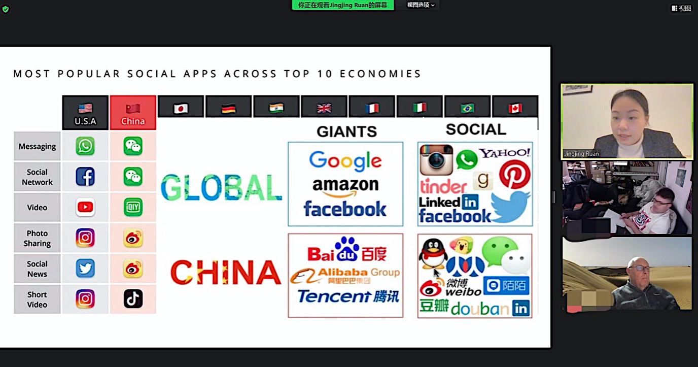 在第二部分,阮老师深入分析了在中国使用最广的社交媒体软件,包括:微信、微博、小红书、抖音和相关视频网站,通过丰富的图片和视频展示了疫情前后社交媒体对电商及直播行业发展的影响,提出内容驱动和技术创新是相关企业持续占领中国商场的关键,引导学员们讨论了社交媒体对社会变迁和经济发展的影响。