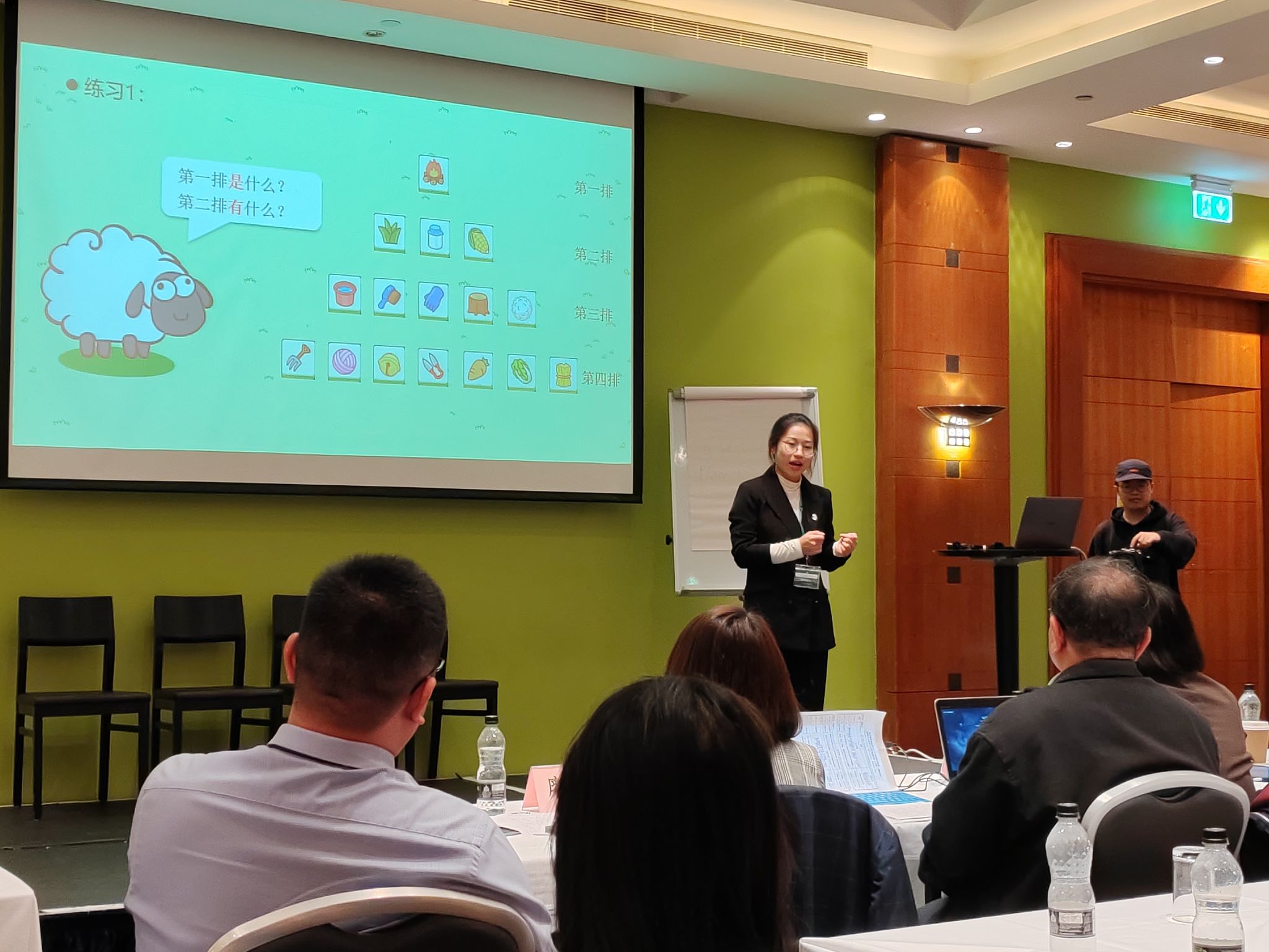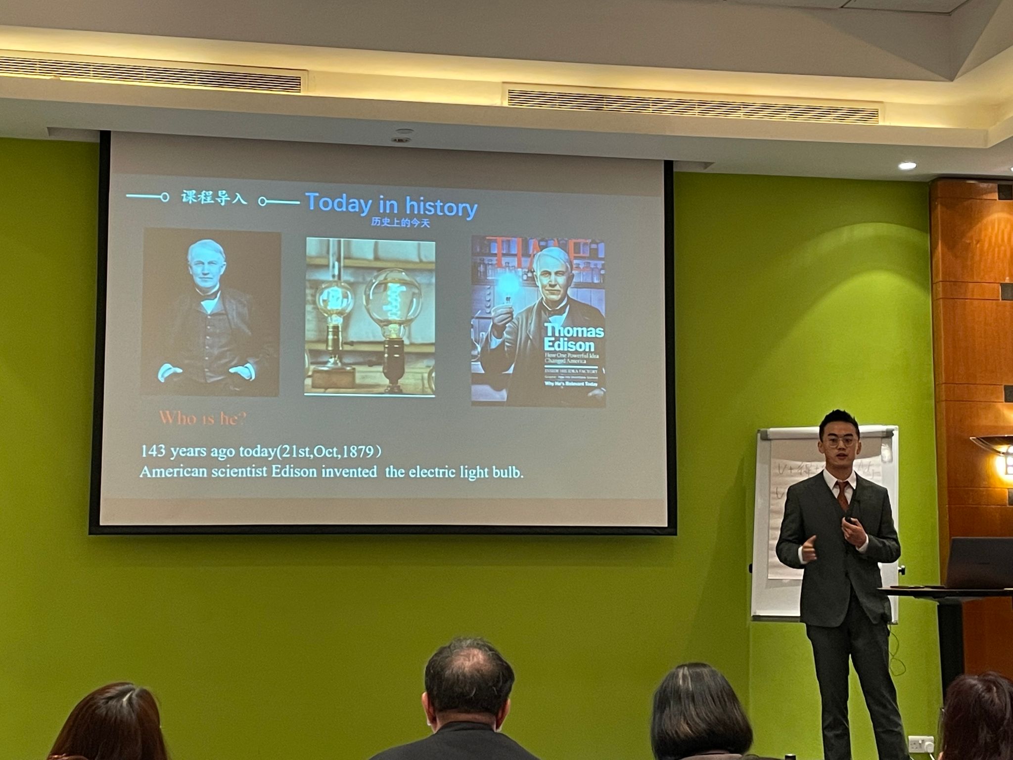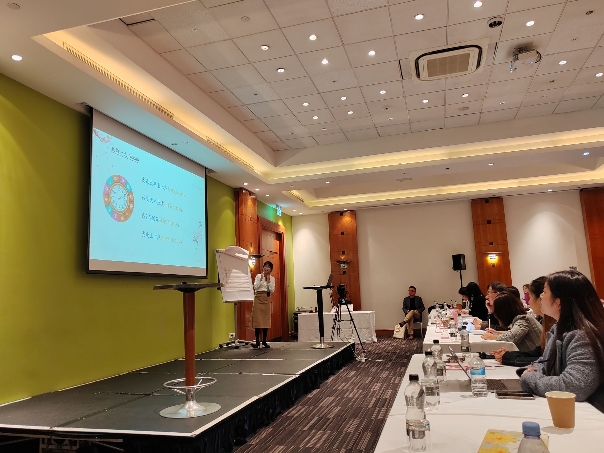 汉语教师志愿者何子耕作为三号选手率先上场。何子耕老师根据自身教学实际情况,设计了针对汉语初级水平英国初中生的词汇学习课程。如何将简单枯燥的词汇课教授的有趣且丰富,是何子耕在这节课上最大的思考与突破。何子耕老师展现出的良好精神面貌、激情的授课方式、活跃的课堂气氛给现场评委和观众留下了深刻印象。