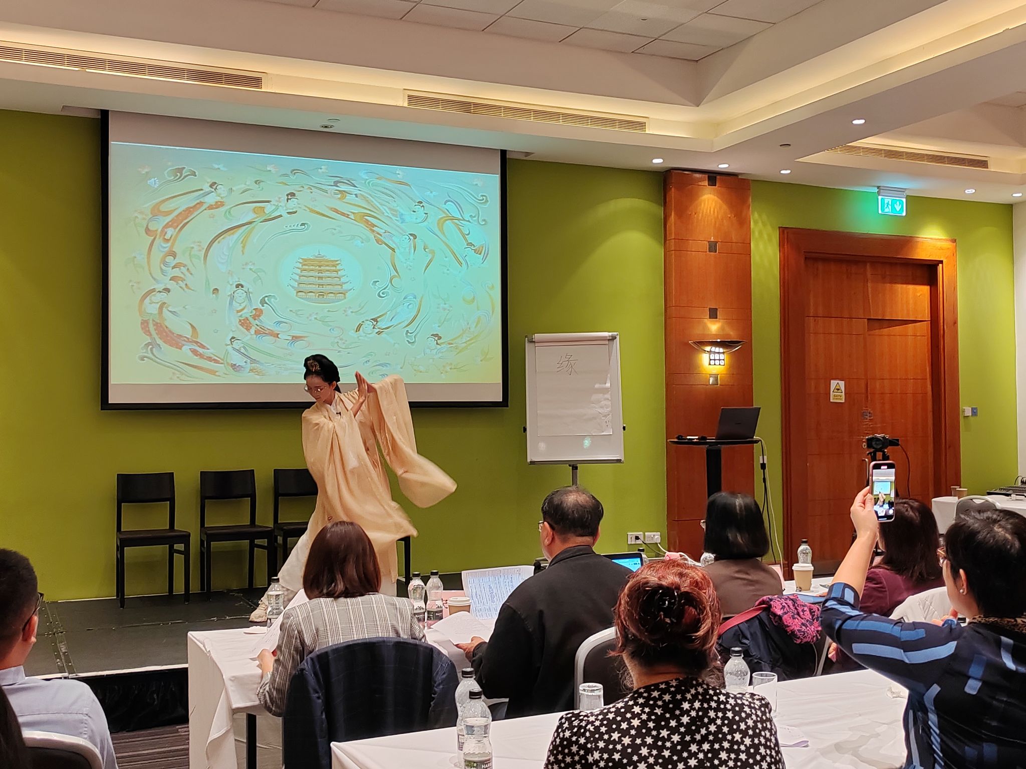 汉语教师志愿者雷雪婷作为十一号选手在下午场登场。她为评委和观众带来了一场别开生面的汉服文化课。雷雪婷老师身着汉服,以一段优美高雅的敦煌舞作为课程导入。她沿着历史脉络,对汉服颜色、形制、功能的发展进行了详尽的介绍,最后点出“美美与共,天下大同”的核心思想,不论是从形式上还是内容上都给现场评委观众带来了一场收获颇丰的汉服文化课程。
