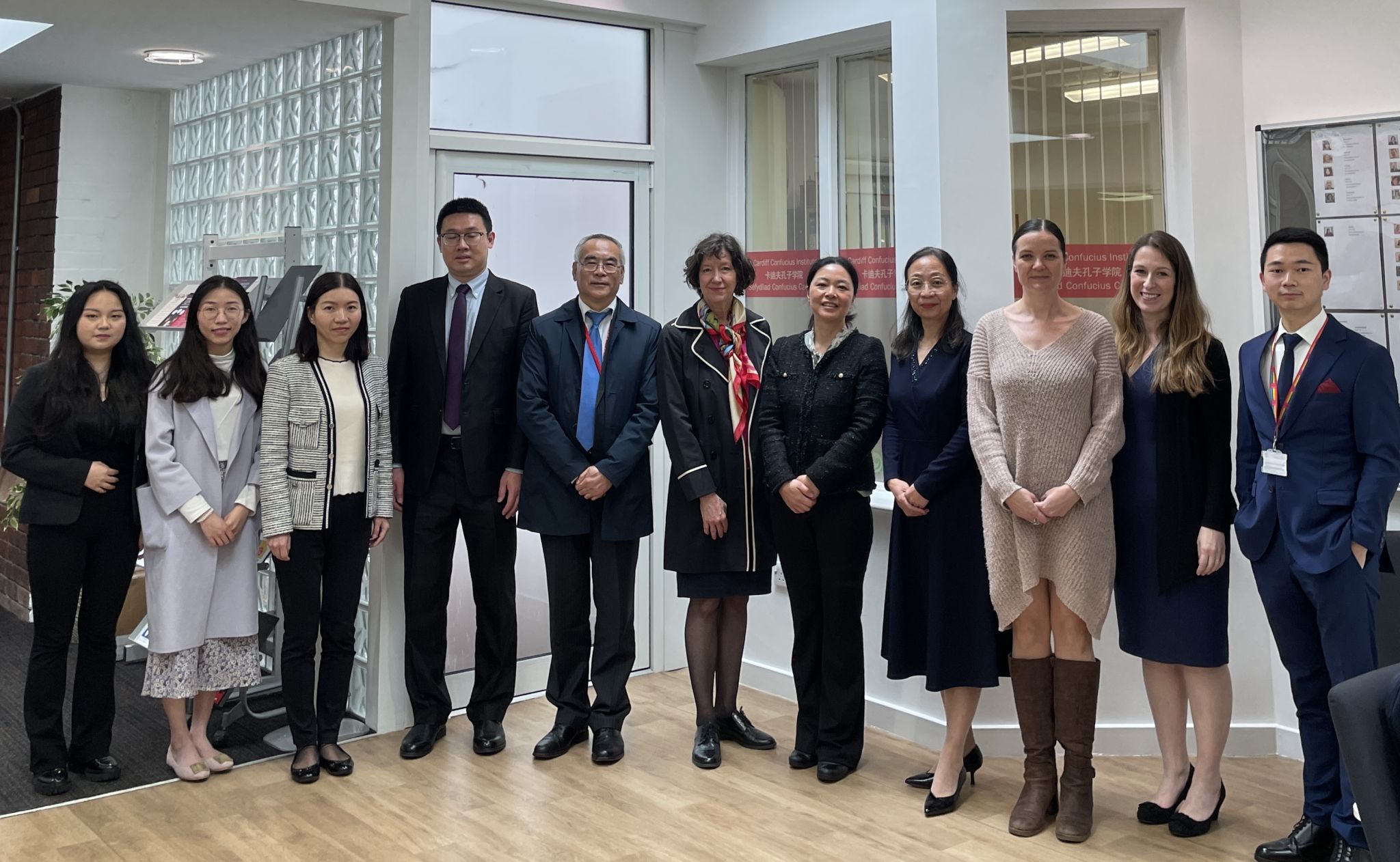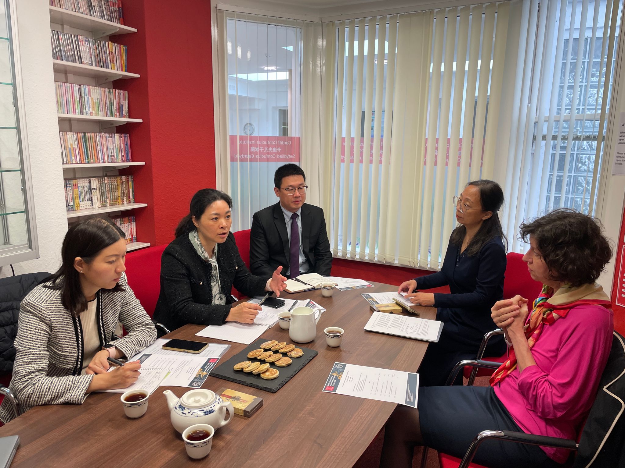 2022年5月25日,中国驻英国使馆教育处公使衔参赞张晋一行应邀访问了威尔士卡迪夫大学子学院。孔院中方院长叶本兰、英方院长柯思宁 (Catherine Chabert)、项目经理罗莎莉 (Rosalie Terpstra)以及中小学项目经理维多利亚(Victoria Ucele)接待并陪同访问。