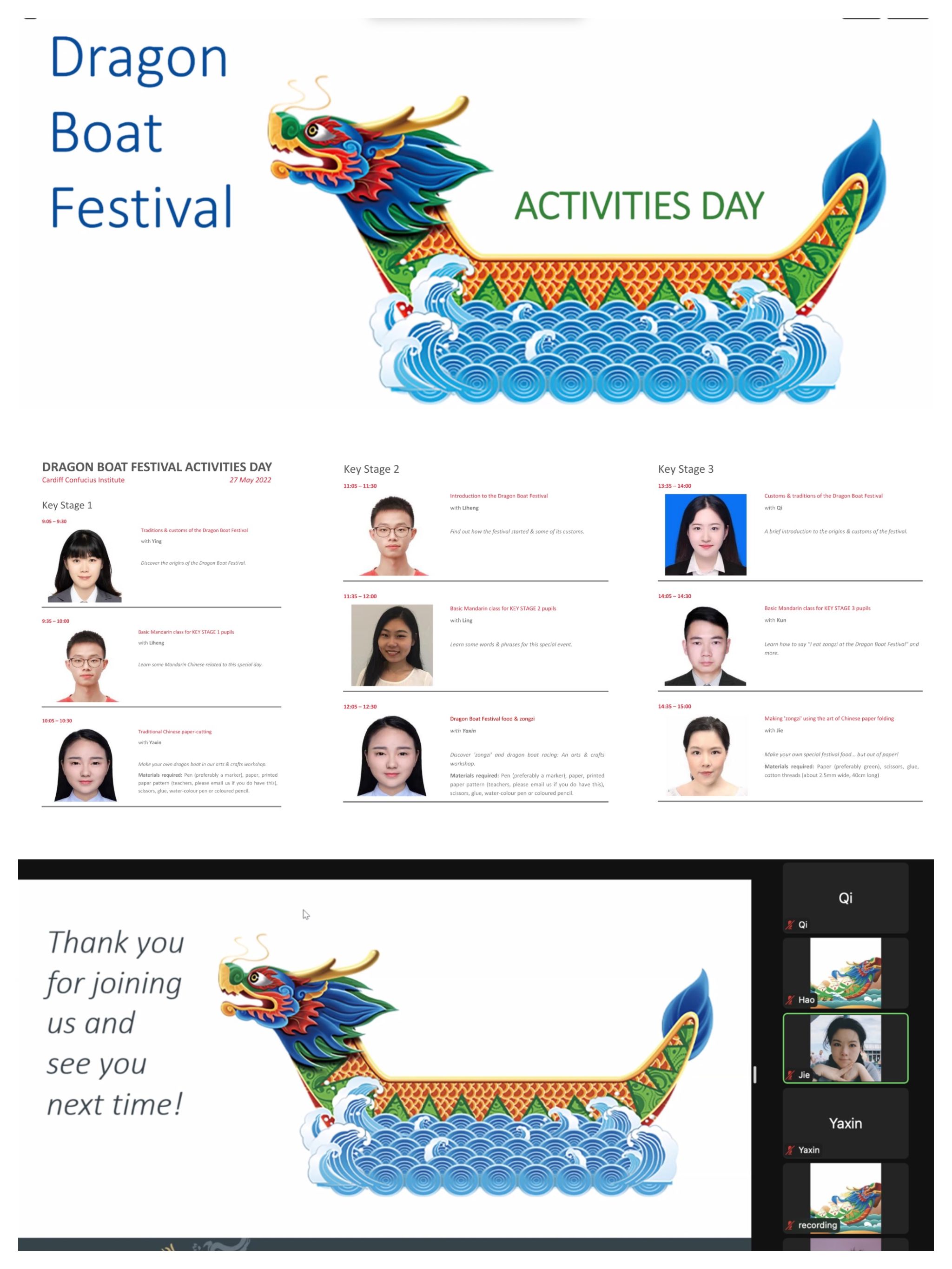 当地时间5月27日,英国卡迪夫大学孔子学院为威尔士地区中小学举办了一场别开生面的线上直播活动,此次活动以庆祝即将来临的端午节为主题,贯穿端午文化介绍、语言课程和文化手工坊等多个内容。来自威尔士地区不同学校的二十多位老师为他们的学生预约注册了本次直播活动。