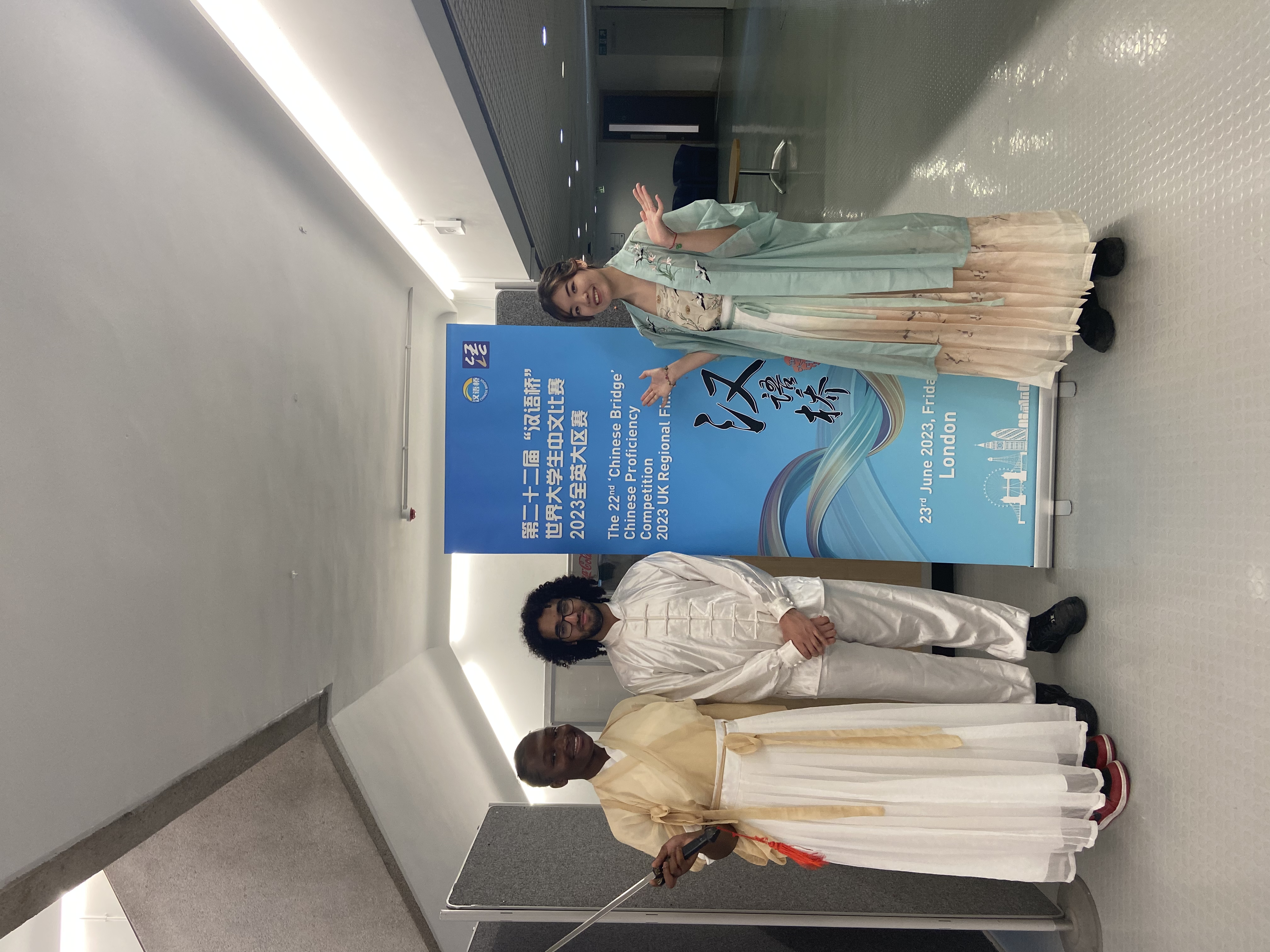 当地时间6月23日,卡迪夫大学孔子学院选派的三名中文系学生万佳芯(Isabelle Jian Sing Watt)、叶雅格( Isaac Abdulla Yehia)、梦娜( Guilhermina Mendes)赴伦敦参加第二十二届“汉语桥”世界大学生中文比赛2023全英大区赛——专业组选手决赛。本次大赛有近200名观众在现场观赛,数百名观众线上观摩,活动还通过Youtube进行了现场直播。大赛的主题为“天下一家”,经过激烈角逐,三位同学均获得大赛“参与奖”。