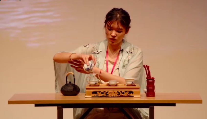 最后一位上台的选手是万佳芯,她的指导教师是邓施懿。佳芯在演讲中充满感情的说:“我们来自五湖四海,不同河流孕育不同文化,英国有泰晤士河,中国有黄河长江,条条长河奔流不息,百川入海,开启新的征程。我们以汉语为桥,江海相通,心手相连,集聚一堂,开启传播中国文化的新篇章。”赢得了观众们的阵阵掌声。才艺展示环节,她表演了中国茶艺,邀请观众共品中国茶,共观茶艺雅。最终在全场选手人气中,获得人气第二的好成绩。