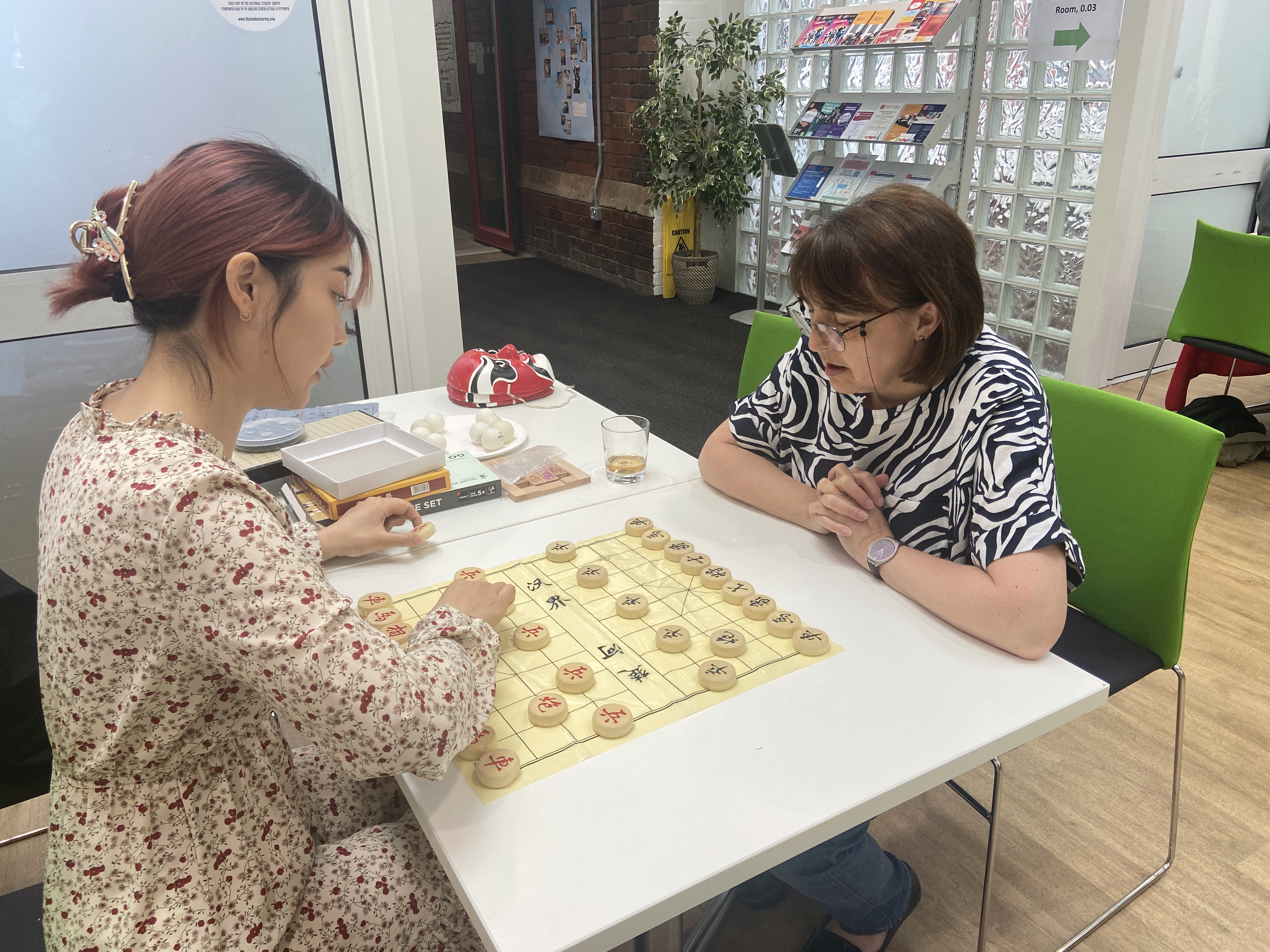 在棋类游戏体验区,公派教师张苗与体验者共下一盘象棋。卡迪夫大学学生活动中心教职工表示,中国象棋有其独特的规则,希望有机会能够再次体验。