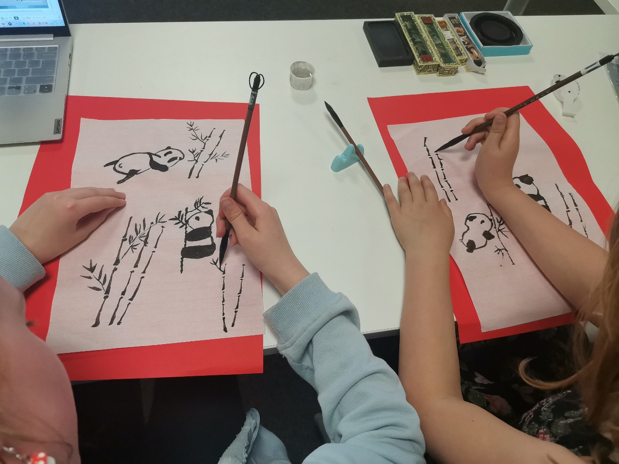 练习完汉字后,本着书画同源的理念,雷雪婷给大家普及了一些国画的小知识,并带着大家学习了竹子和熊猫的画法和技巧,孩子们都非常喜欢熊猫,看到熊猫的照片都很兴奋,有的照着例图画出了可爱的熊猫竹子,有的天马行空,创作出完全属于自己的熊猫世界。两位老师在一旁不断鼓励大家,最终每个人都画出了憨厚可爱又充满童真的熊猫作品。大家纷纷和自己的书画作品合影留念,本次活动也在一片温馨的氛围中结束。