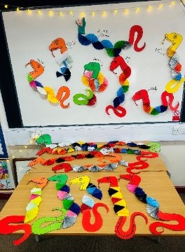 杨老师用“年”的传说和蛇年生肖的故事吸引了七年级的学生们。而后的春节风俗、特色食物和活动的展示也无不传达出中国人祈福之心和团圆之念。同学们伴着欢庆新年的音乐,动手参与到迎接新年的准备中来,完成了剪纸“春”、灯笼、蛇年书签和生肖蛇的制作。