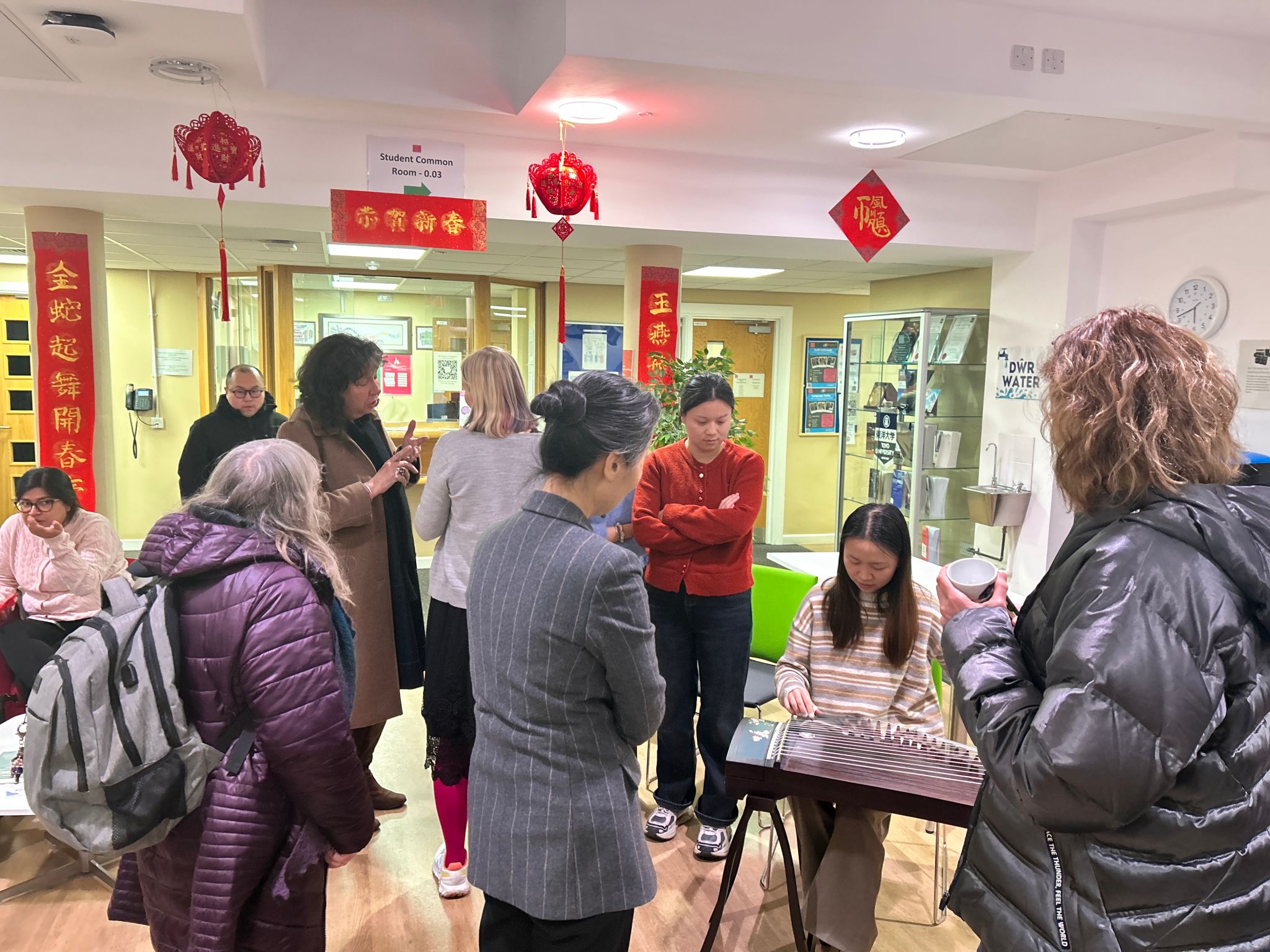 活动现场,卡迪夫大学孔院志愿者肖小月为与会人员带来了精彩的古筝演奏,悠扬的琴声为茶艺展示营造了浓厚的东方韵味。