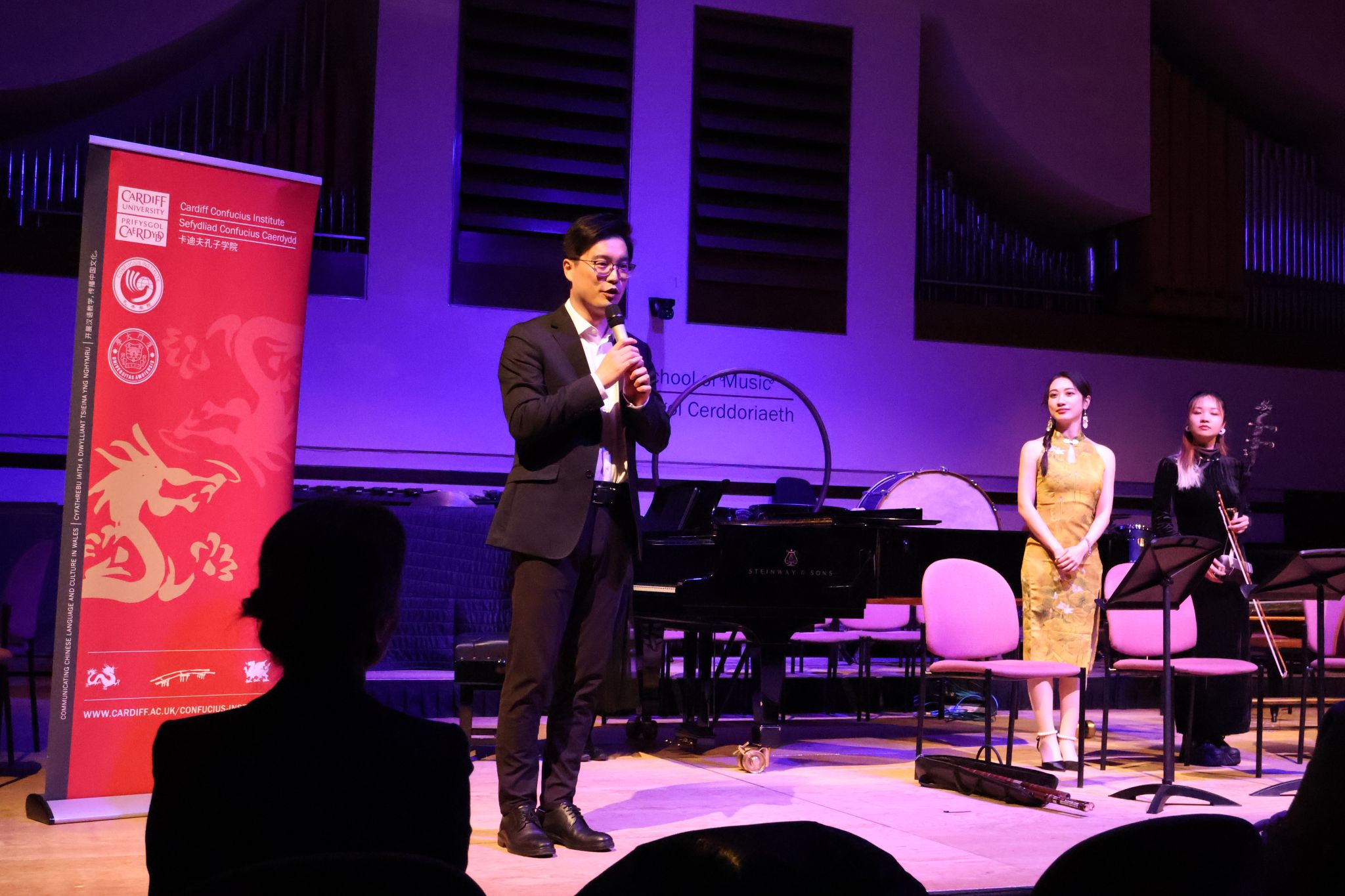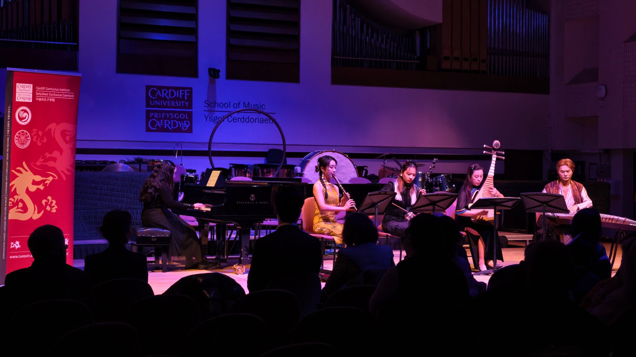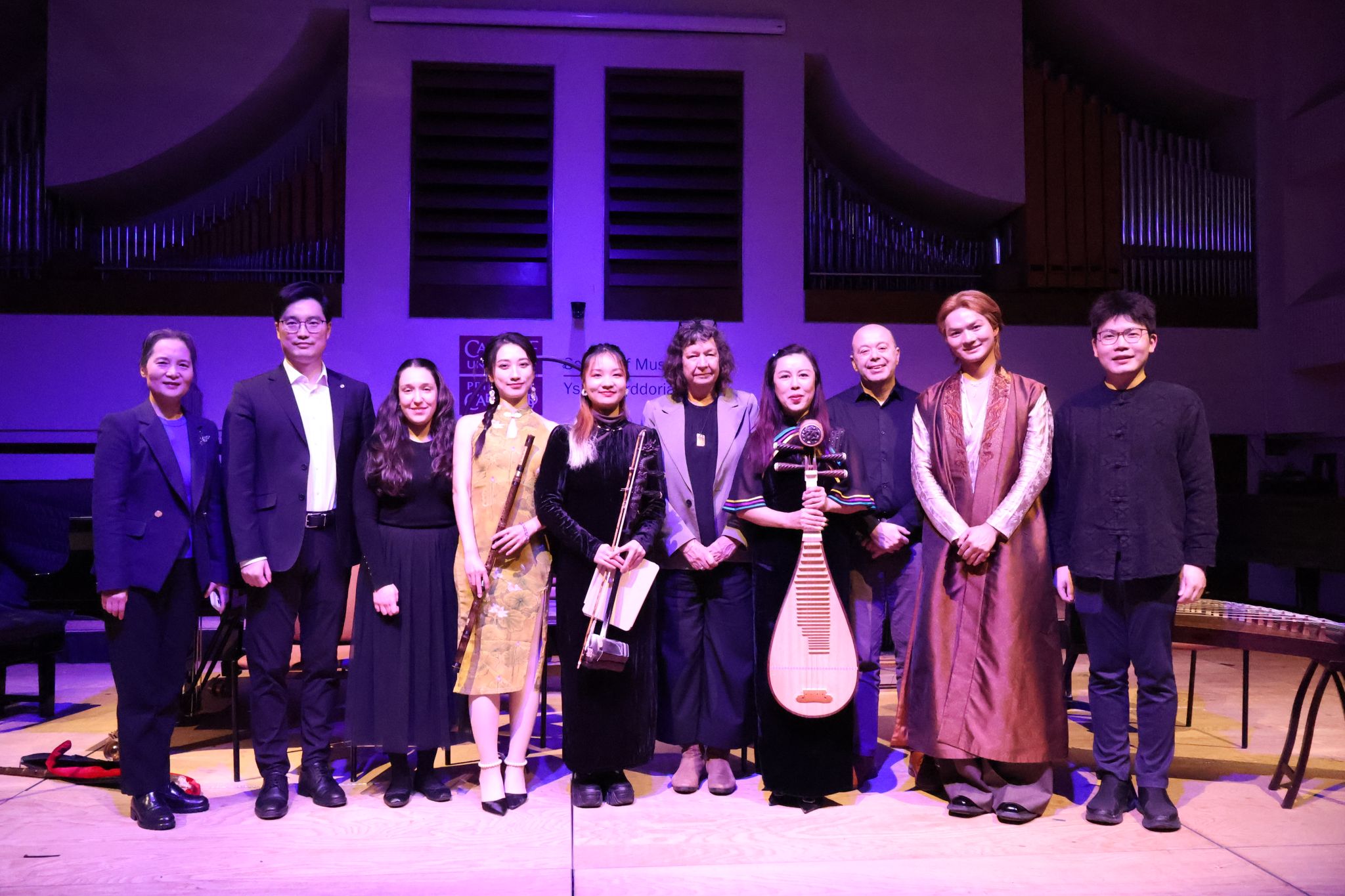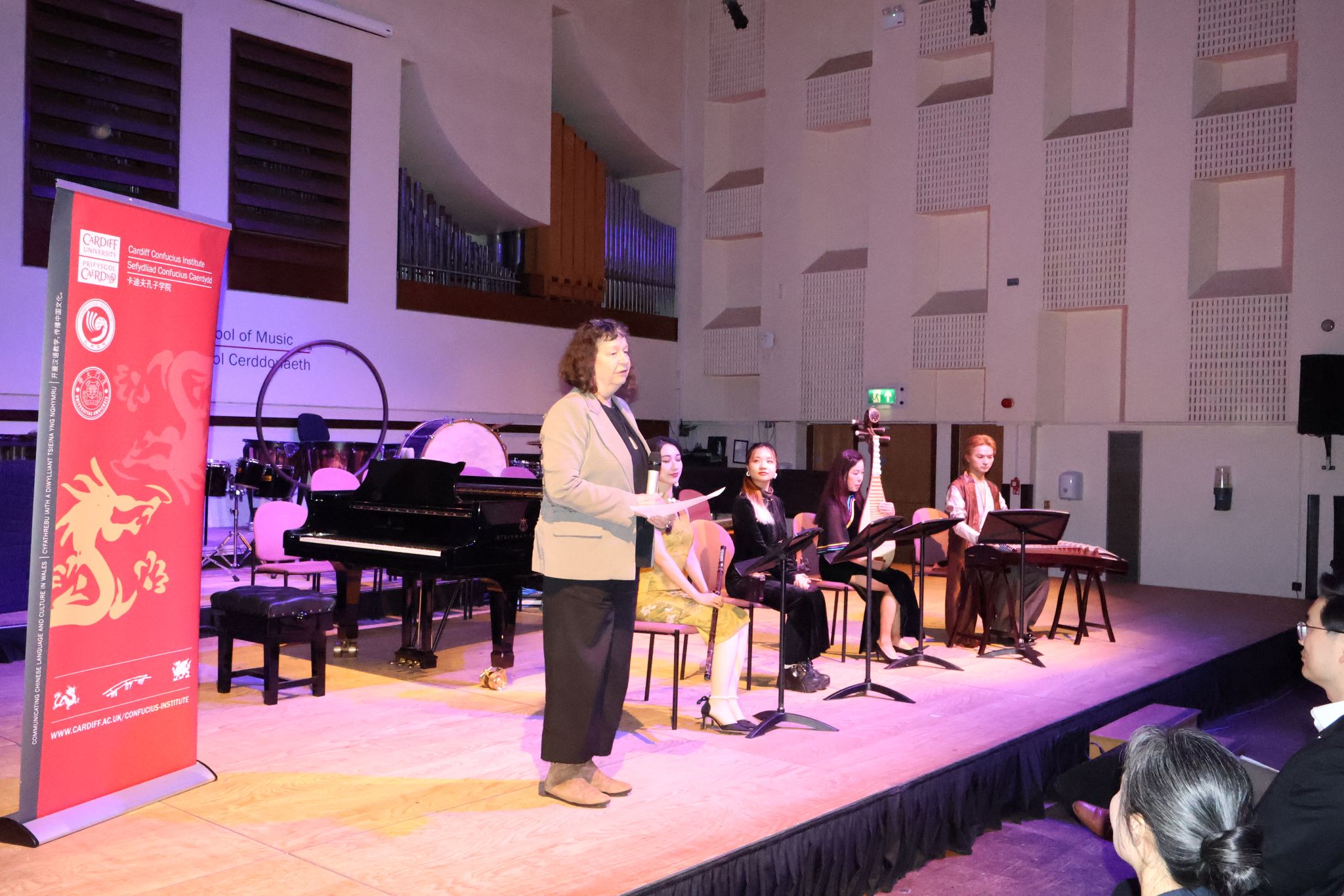 当地时间11月25日晚,英国卡迪夫大学音乐学院音乐厅内座无虚席,灯光柔和,气氛庄重而温暖。由卡迪夫大学孔子学院与卡迪夫大学音乐学院、英国中乐团联合举办的“流音交汇”音乐会在此隆重举行。卡迪夫大学校长温迪·拉纳教授(Prof. Wendy Larner),音乐学院院长尼古拉斯·琼斯教授(Prof. Nicholas Jones),中国事务国际院长兼孔院外方院长周鹏教授,孔院中方院长夏国香教授及孔院教师、大学师生和当地民众等七十余人齐聚一堂,共同聆听了一场融汇东西、贯通古今的音乐盛宴。