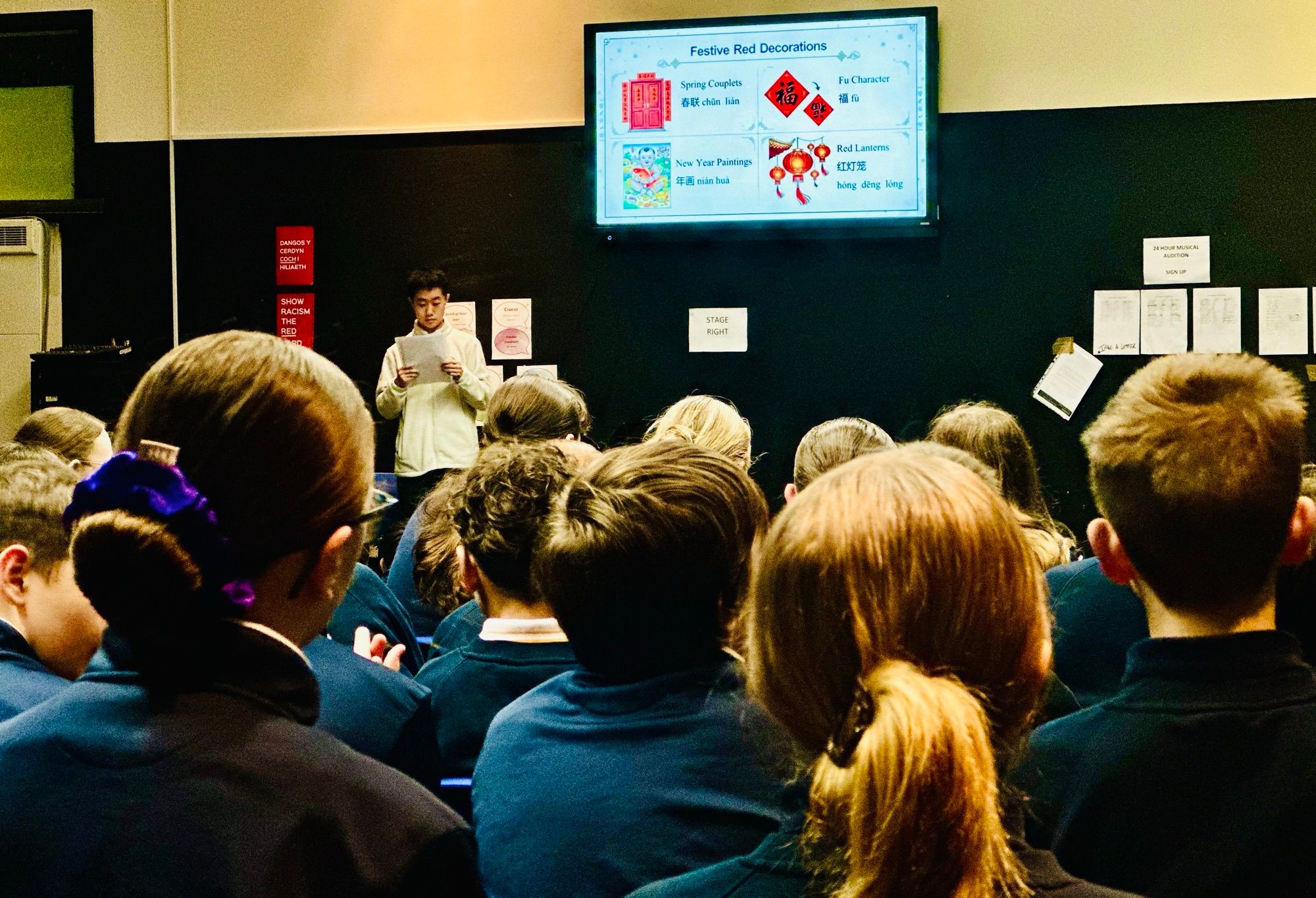 与此同时,Ysgol Aberconwy 为七、八年级400余名学生举办春节主题集会。活动由校长主持,孔子学院教师进行专题分享,系统介绍春节的历史渊源、“年兽”传说及团圆饭、红包、舞龙舞狮等传统习俗。通过生动讲解与互动交流,学生们对中国最重要的传统节日有了更为全面的认识,进一步拓宽了文化视野。