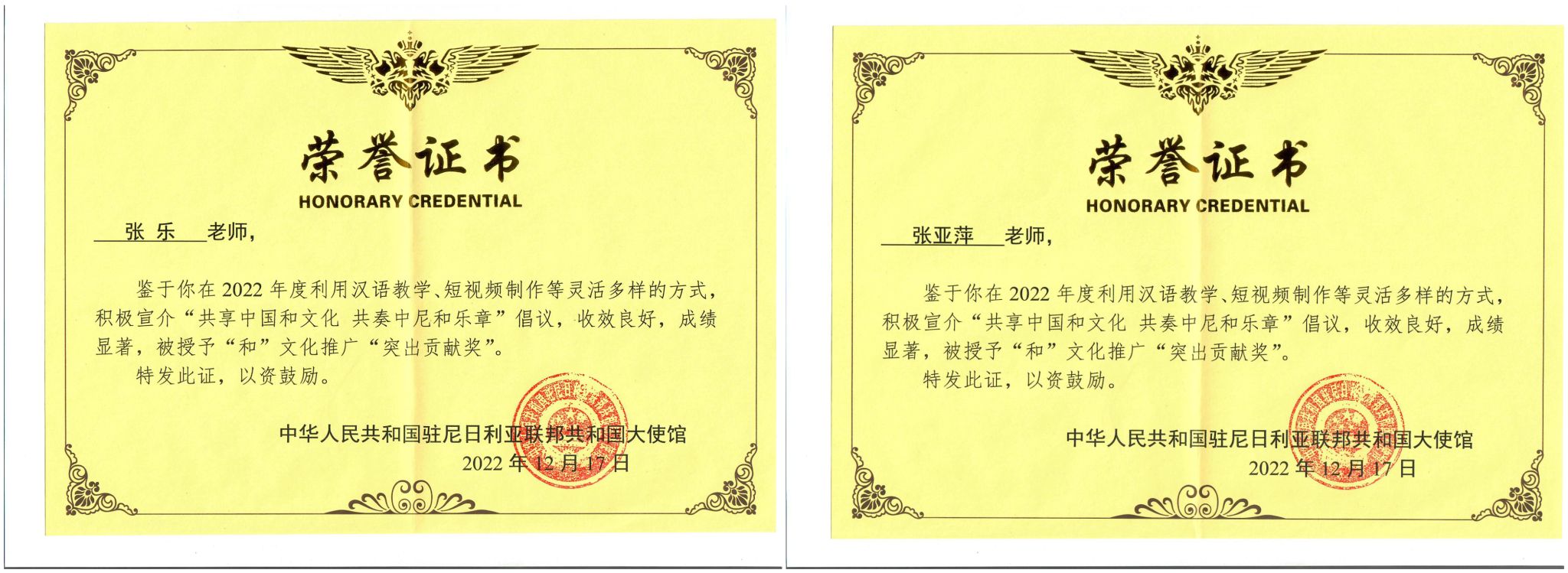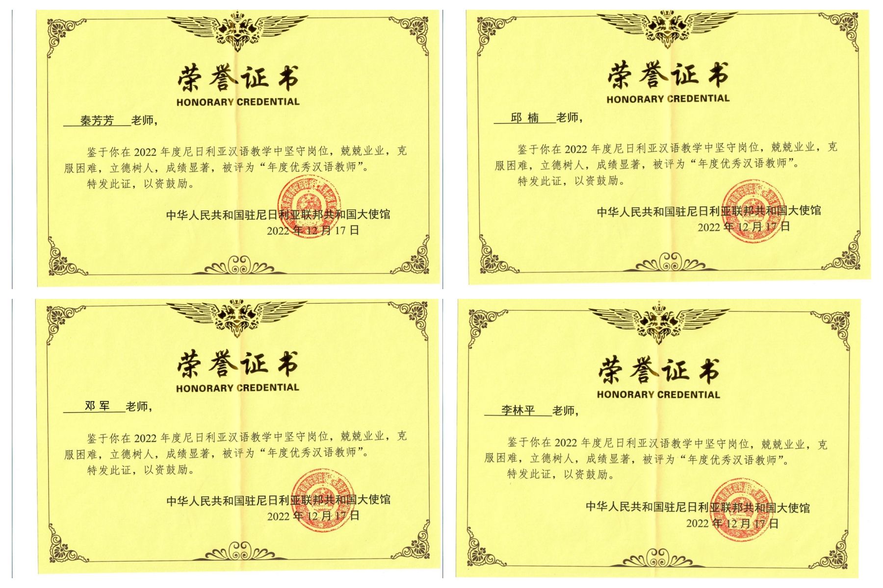 纳姆迪·阿齐克韦大学孔院有6名公派教师获殊荣,这是韦大孔院教师首次荣获大使馆殊荣,为韦大孔院荣誉榜上添了新篇章。张乐和张亚萍2位公派教师荣获中国“和”文化推广“突出贡献奖”;邓军、李林平、秦芳芳、邱楠4位公派教师荣获尼日利亚“年度优秀汉语教师奖”。