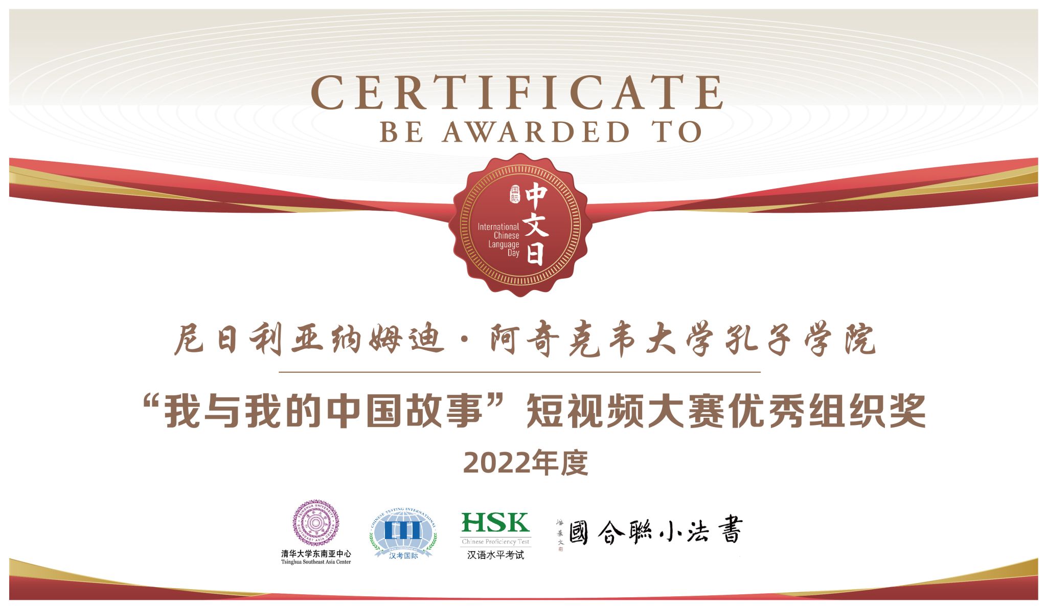 8月22日,由汉考国际与清华大学东南亚中心、书法小联合国共同主办的“我与我的中国故事”短视频大赛颁奖典礼顺利举行,尼日利亚纳姆迪•阿齐克韦大学孔子学院斩获2个“二等奖”、“激励奖”和“优秀组织奖”共四个奖项。