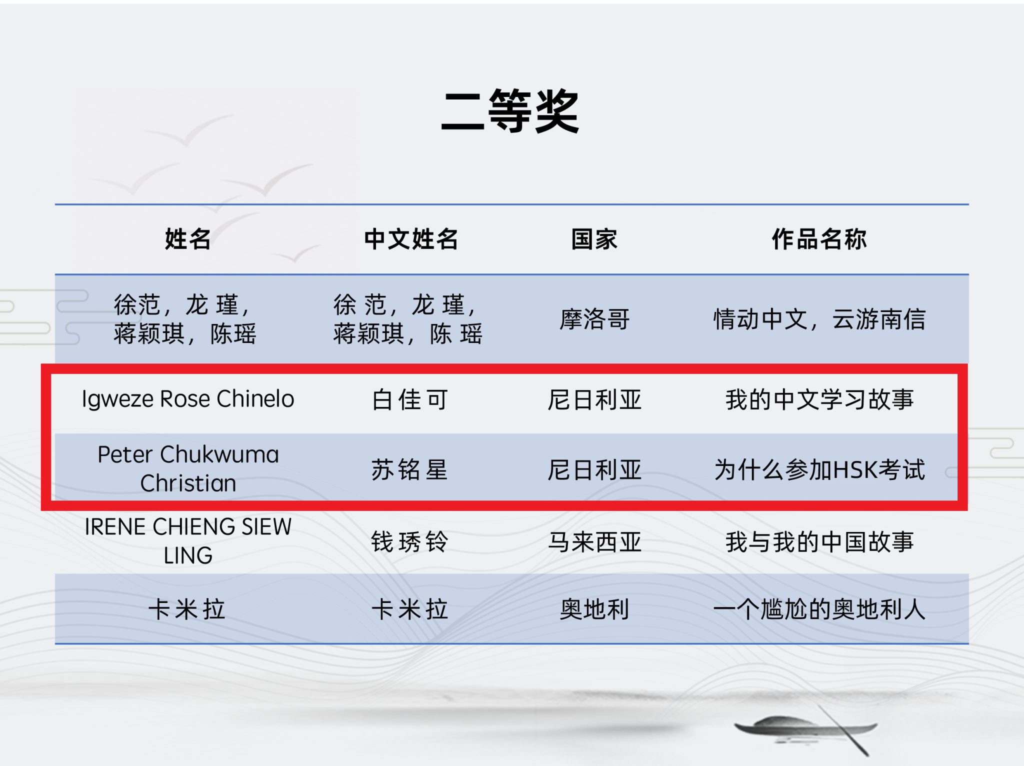 白佳可(Igweze Rose Chinelo)和苏铭星(Peter Christian Chukwuma)是在孔院相识相爱的一对情侣,他们分别获得”二等奖”,谢苔丝(Onwufurugwu Ijeoma Tessy)同学获得“学习激励奖”,此外,我院荣获“参赛优秀机构组织奖”(海外)。