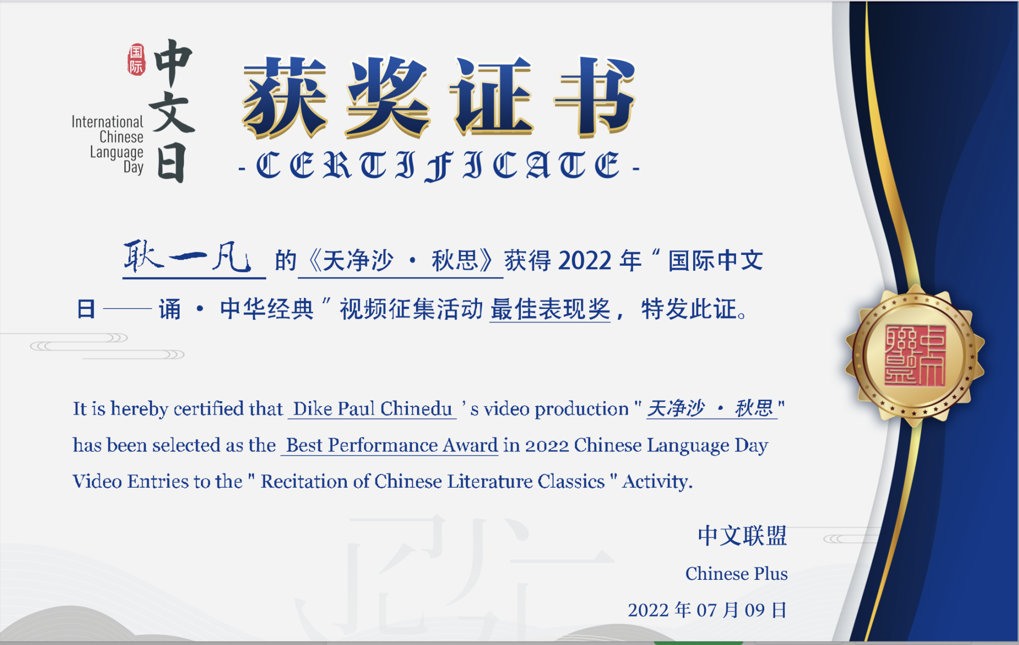 来自纳姆迪•阿齐克韦大学孔子学院的耿一凡(Dike Paul Chinedu)同学,在今年“汉语联盟”主办的“国际中文日”“诵•中华经典”活动中,荣获“最佳表现奖”,评奖结果于近期揭晓。