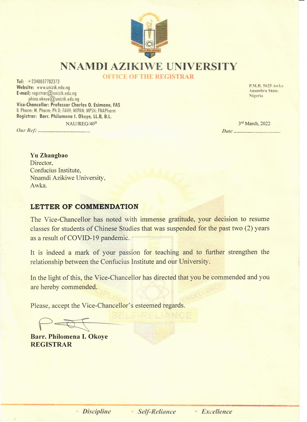 3月3日,韦大孔院收到尼日利亚科学院院士,大学校长查尔斯•埃赛莫奈(Charles Esimone)教授的特别嘉奖信,校长感谢和表彰孔院恢复中文线下教学活动,该嘉奖信通过大学教务长,律师Philomena Okoye女士签发送达孔院。