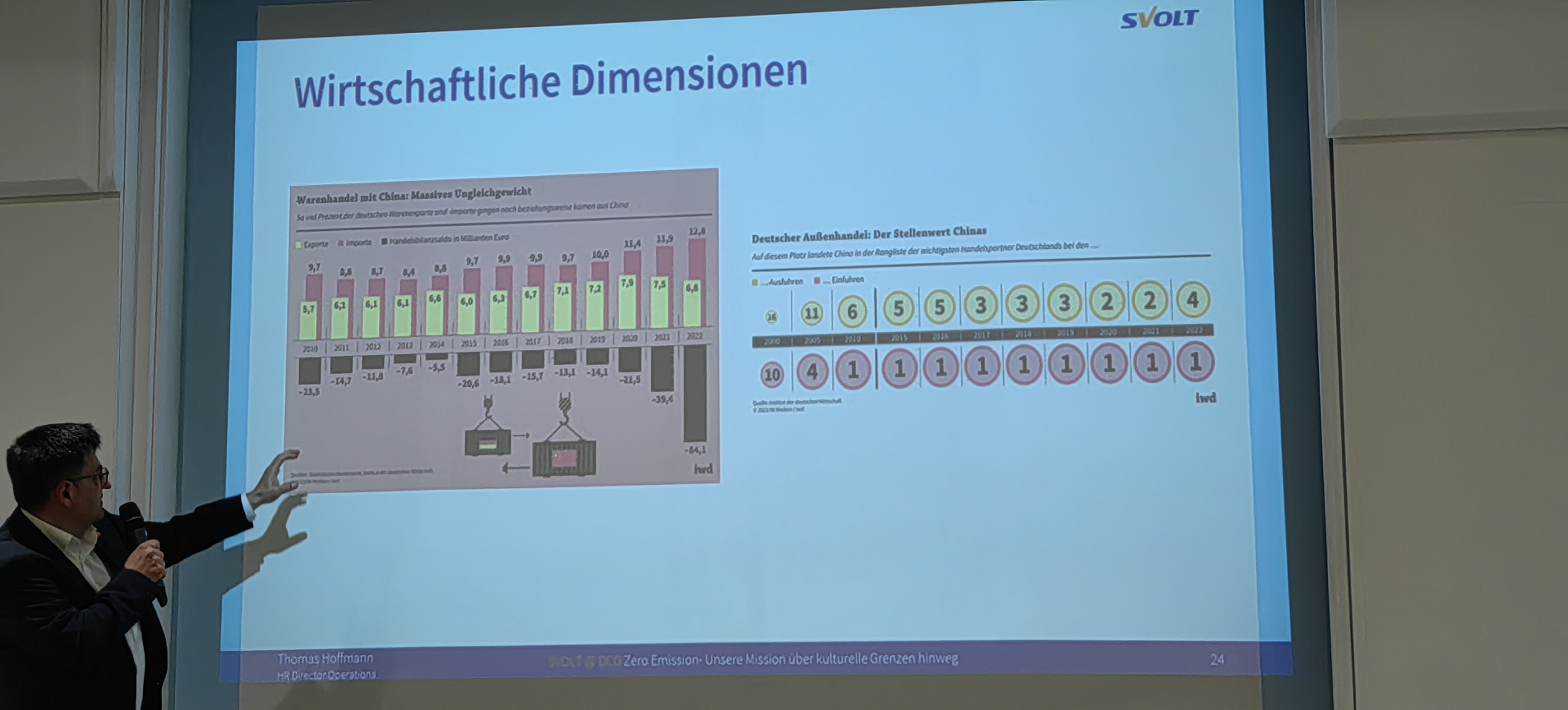 接下来由蜂巢能源德国公司(Svolt)的人力资源主管霍夫曼先生带来了题为《零排放:跨越边境的使命》的讲座。他从这家中国公司在欧发展布局,以及选择入驻萨尔州的缘起谈起,并就管理层和员工对跨文化差异的理解和如何消除壁垒,从等级观、物质观、集体观、社会地位及灵活性五个方面做了详细的阐述,获得现场会心的笑声及热烈的反馈。 这家中国的汽车配件供应商预计将从2022年起为多达50万辆电动汽车生产电池。首先将会在霍伊斯韦勒(Heusweiler)为高压储存系统及模块建立一个工厂,并在于伯黑恩(Überherrn)附近建立一个电芯工厂。这两家工厂的投资额共计约20亿欧元,还将提供2000个工作岗位。蜂巢能源(Svolt)的这项决定意味着萨尔州将迎来30年以来最大型的一次公司入驻。