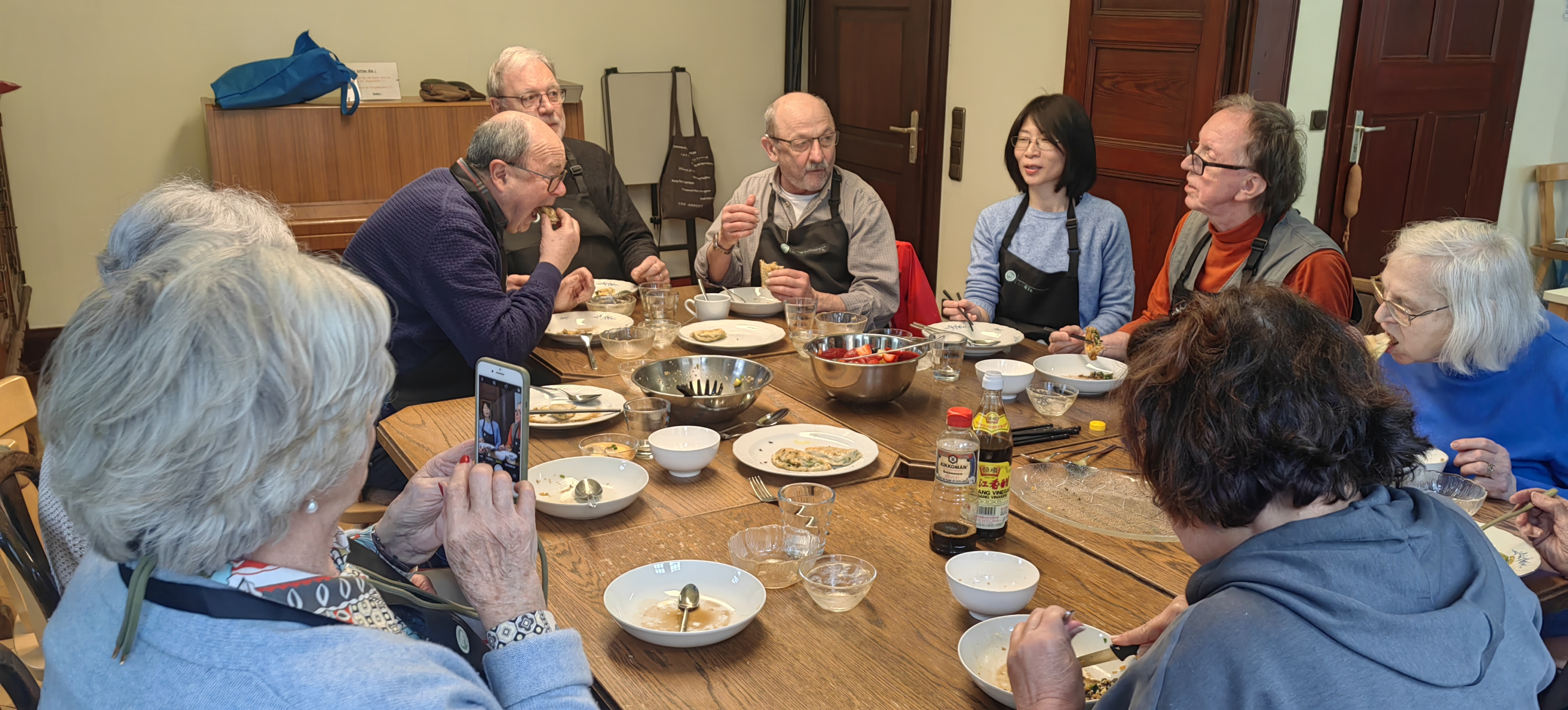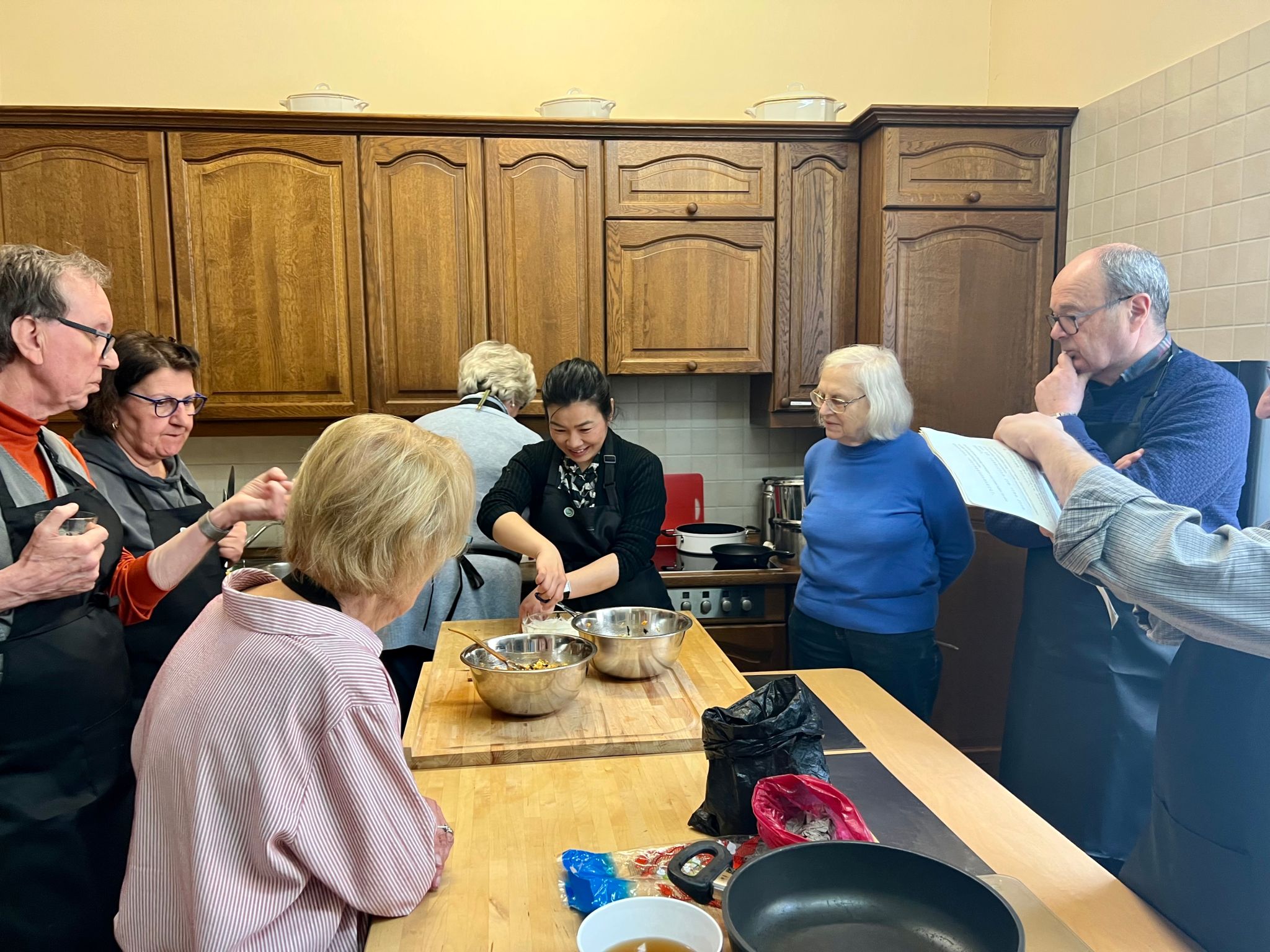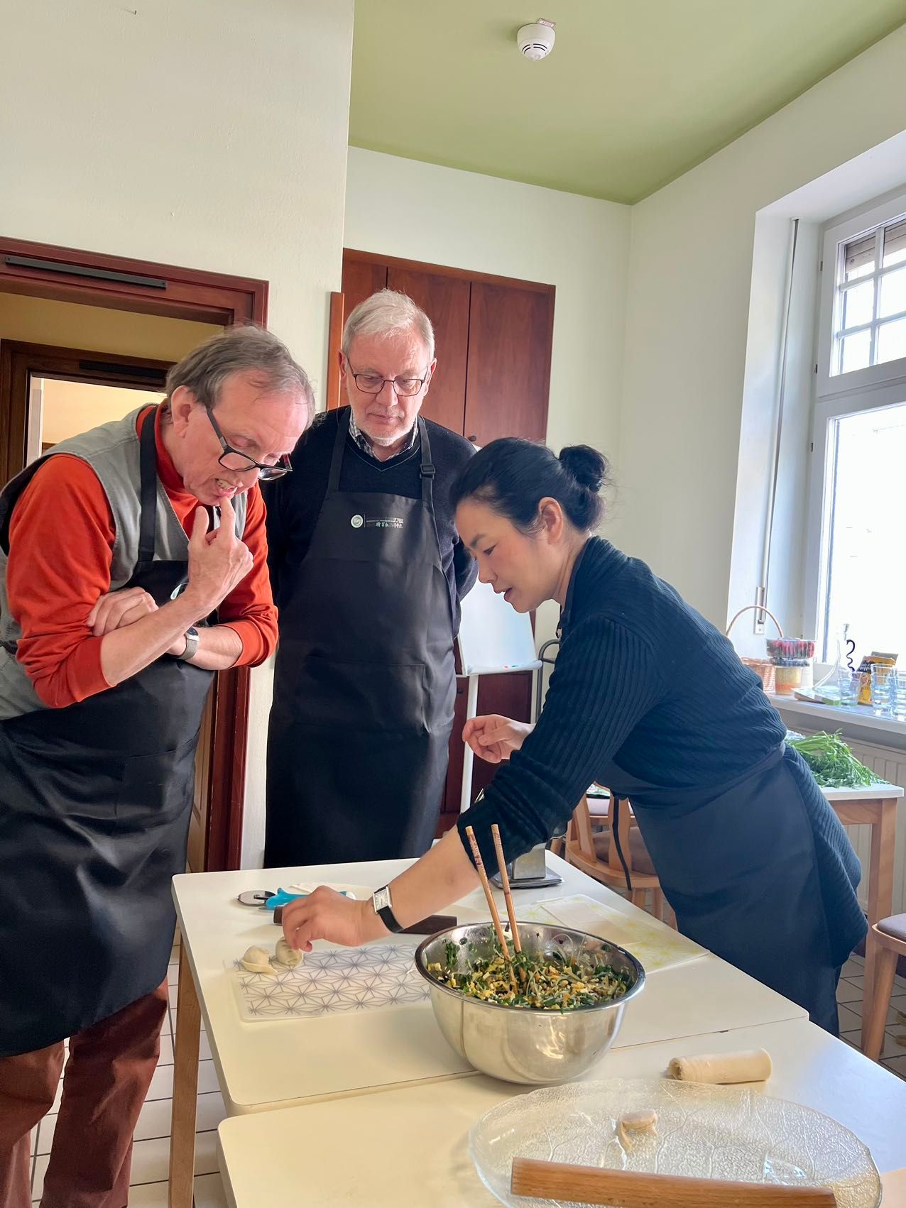 课程伊始,李毅介绍了当天要做的四道菜并分发菜谱,结合本地的荠菜、野韭和野葱样本,介绍了特里尔典型的野菜特征和近似植物辨析;针对中餐常用的调料分享了经验,讨论了生抽与老抽、热榨与冷榨麻油、仔姜和老姜的区别。 接下来大家一起做了三种软硬不同的烫面团进行比较,紧接着就进入热火朝天的制作环节。学员们虽然平均年龄65+,但四个小时内热情饱满、分工有序、合作高效,课程中体现的专业度让人刮目相看。很快,香喷喷的韭菜盒子,滑嫩的香菇炖蛋和拍黄瓜就从案头上了餐桌。大家感叹道:边动手边交流时间过得好快,没想到一次课程能学那么多“秘笈”!海外志愿者教师刘非渺演示了筷子的使用技巧,学员们其乐融融地围坐一圈,边聊边品尝自己的劳动成果。